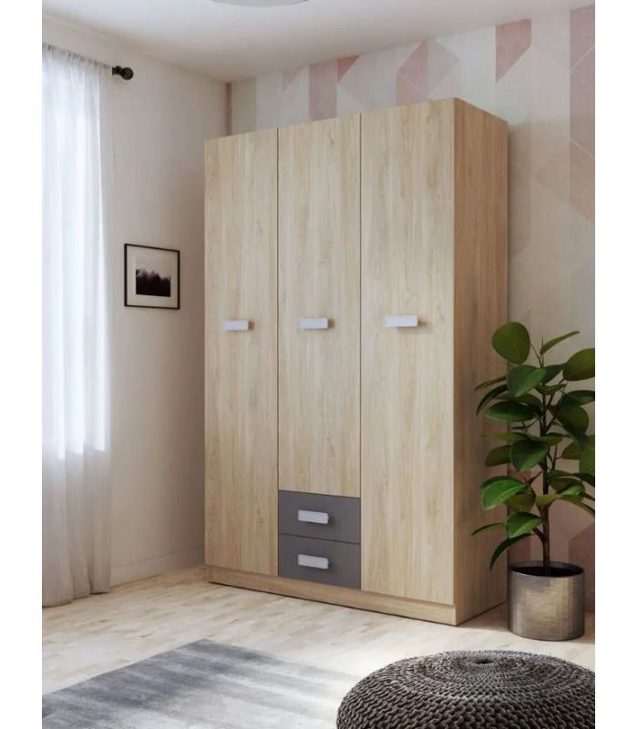 Armario Juvenil 3 Puertas Donald, fabricado en material laminado de primera calidad, color Puccini-Grafito. En su interior incluye barra y altillo, además de 2 cajones exteriores, para mantener el perfecto orden de tu ropa. La combinación de sus colores permiten adaptarlo a gran variedad de estancias. Combínalo con el resto de la colección juvenil Donald.