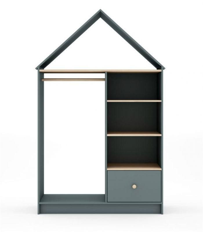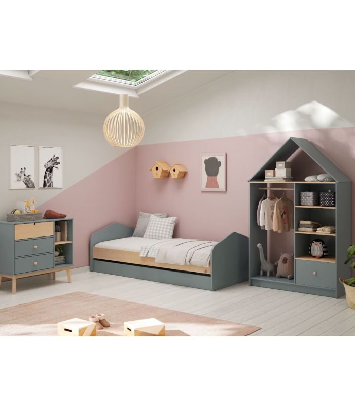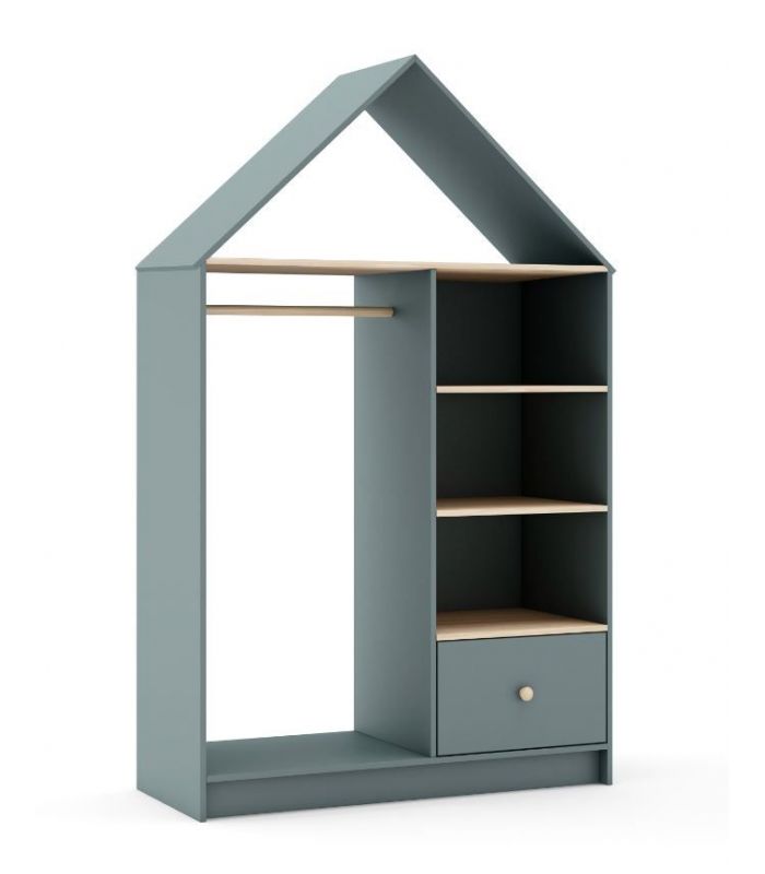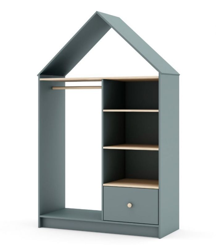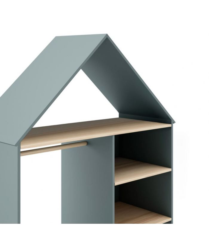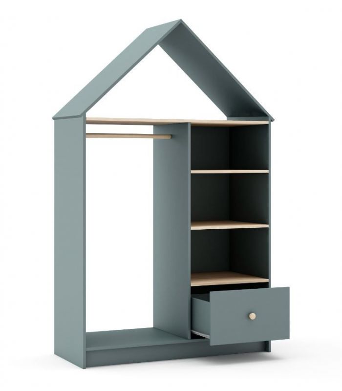 Vestidor Estefanía, está pensada para crear ambientes juveniles acogedores. Está fabricado en madera de pino maciza con veta y DM lacado verde. Compuesto por estantes, cajón y barra para colgar. Su diseño juvenil en forma de casita para hacerla diferente y así que los peques se sientas más acogidos. Combinable con los demás artículos de la colección.