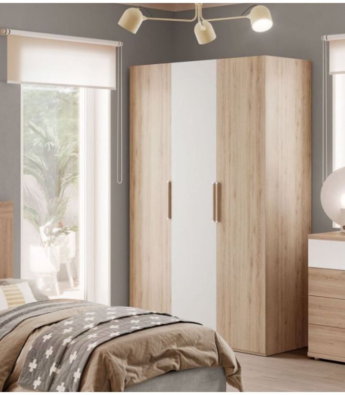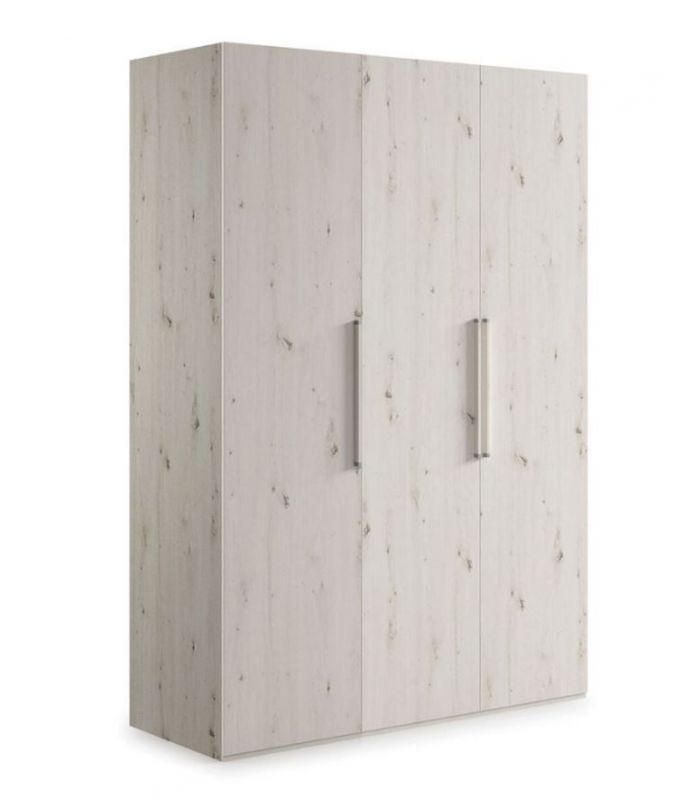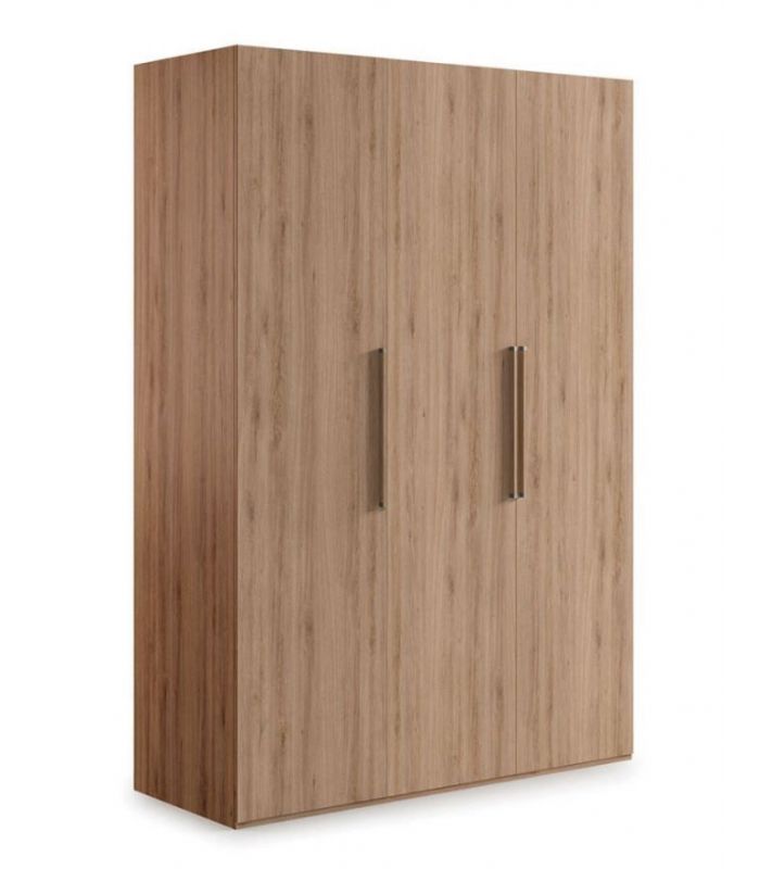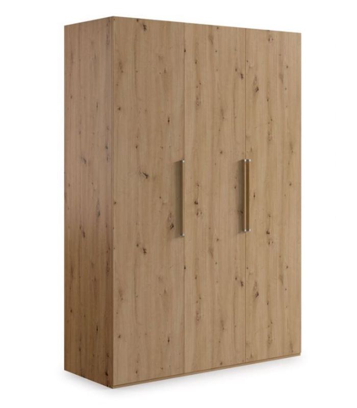 Armario Krona, compuesto de 3 puertas abatibles. Destaca por su gran capacidad, y la alta calidad de fabricación. En su interior se compone de altillo y barra para colgar. Disponible en varios acabados: Roble Natural, Roble Artisan o Albian, con el tirador a juego. Perfecto para todo tipo de dormitorios.