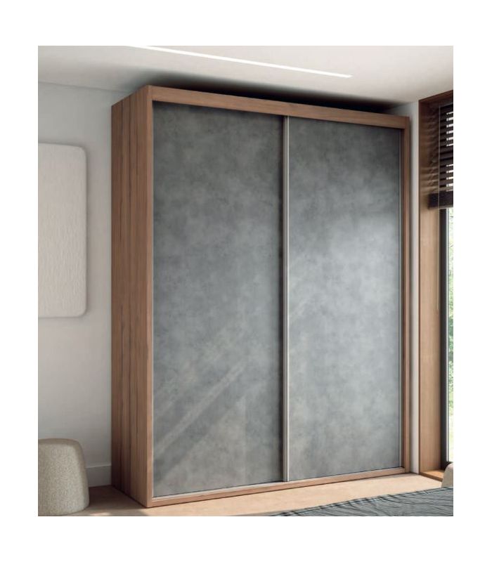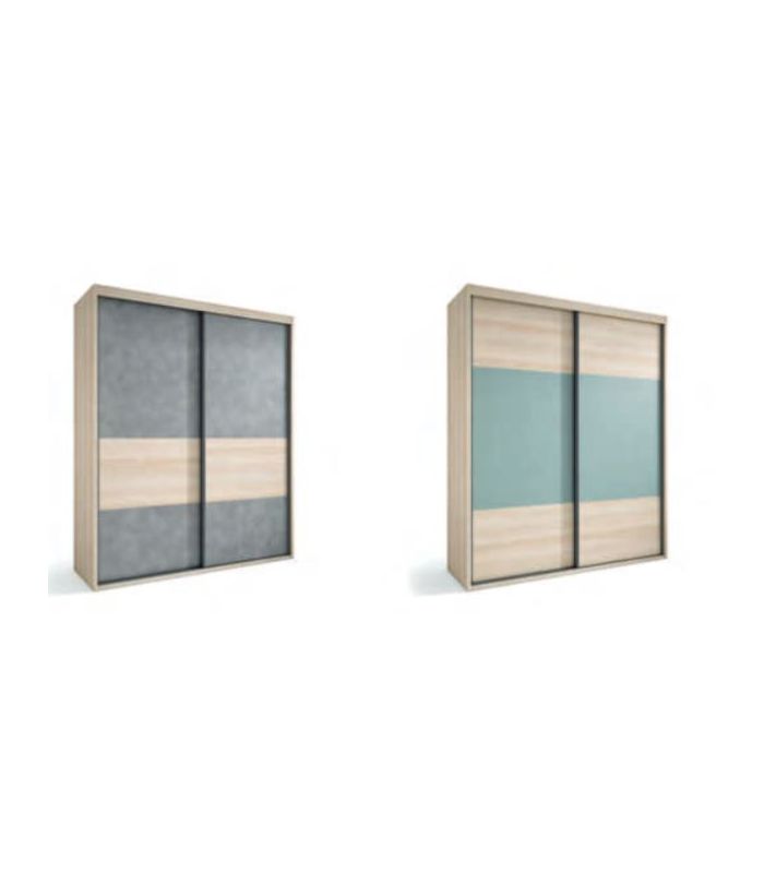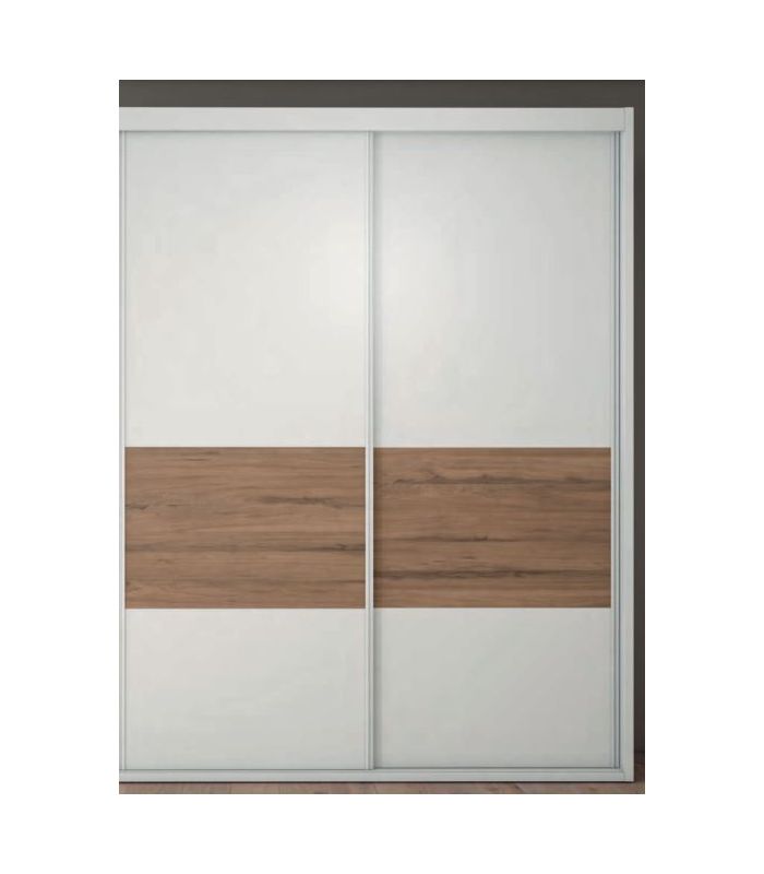 Armario Nilo de puertas correderas con franja central, sus tiradores son de de fácil apertura en el lateral. Disponible en varias medidas. Su diseño moderno y funcional hará que sea sencillo combinar. Está fabricado en material laminado de primera calidad. Su interior está compuesto por altillos y barras para colgar, aunque puede añadir completos (consultar).