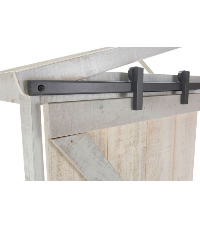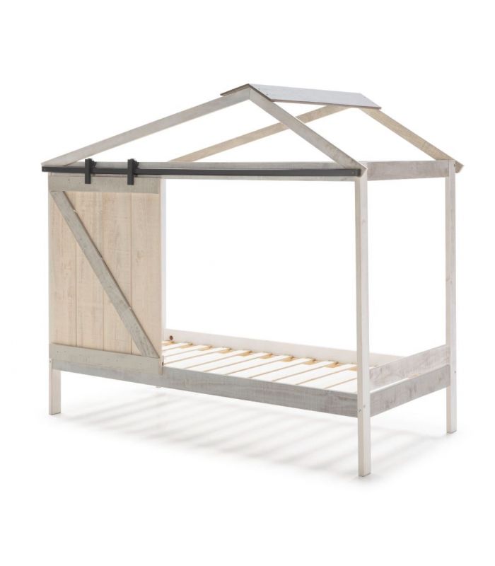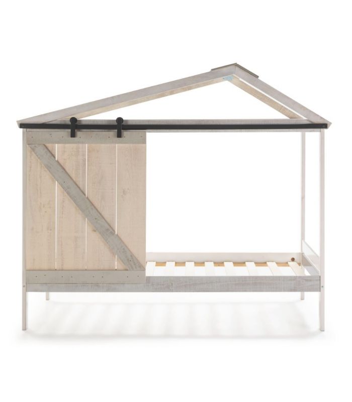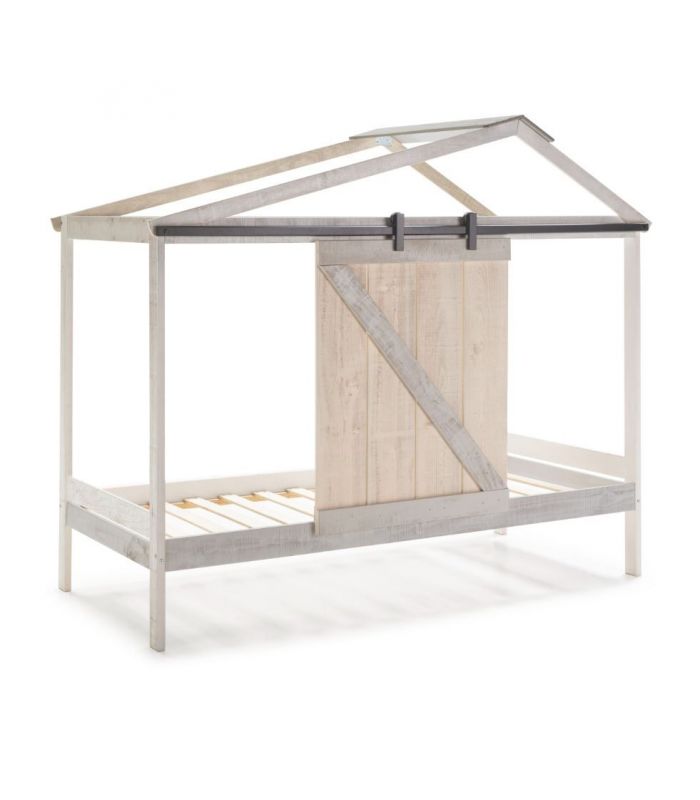 fabricada en madera de pino envejecida blanco y gris claro, y DM en la guía corredera de la puerta, que combina a la perfección. Cuenta con la posibilidad de adquirir un cajón cubo para poner bajo la cama, a modo de almacenaje.