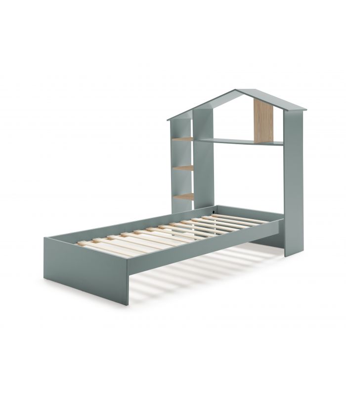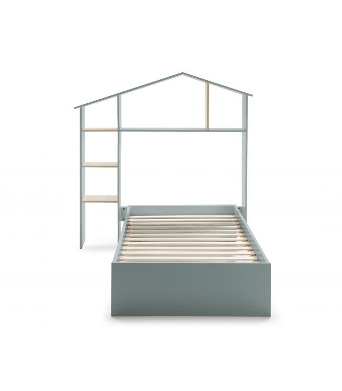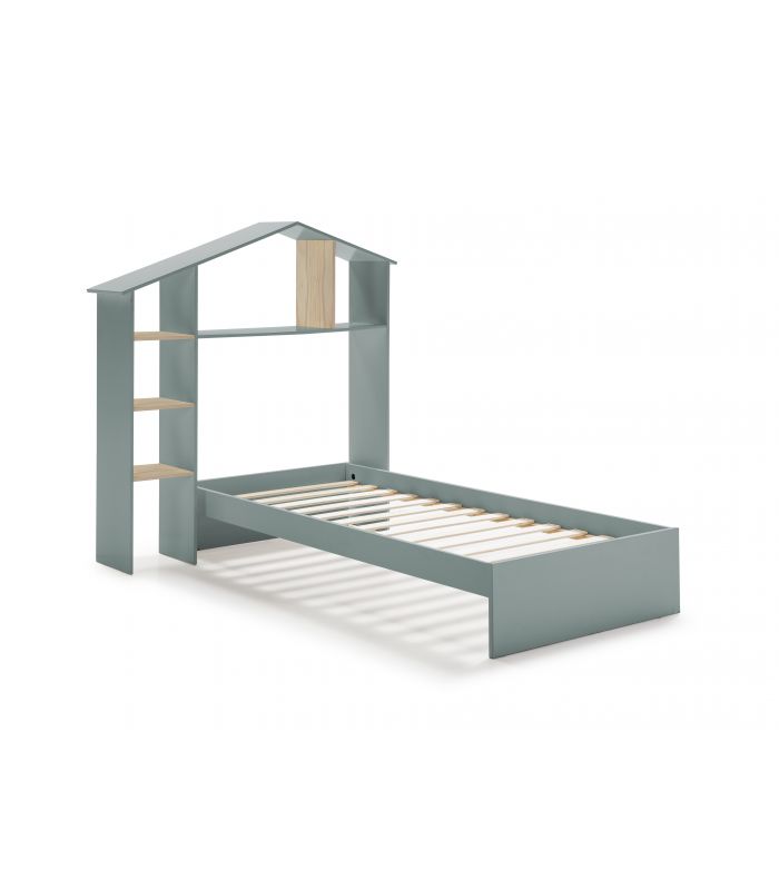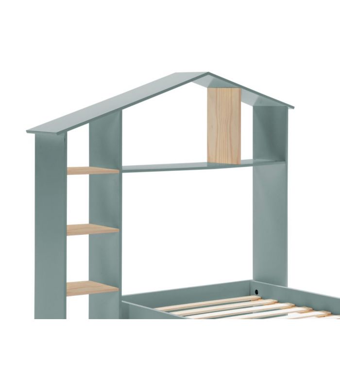 Cama Casita María es perfecta para niños, ya que el diseño de simula la forma de una casa, con estantes para utilizar a modo de almacenaje. Fabricada en madera de pino, acabado natural, y DM lacado en verde petróleo. Su diseño es único y divertido hara que a los niños les encante dormir en ella, cuida hasta el último detalle. Incluye somier.