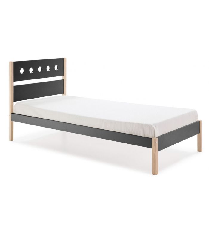 Fabricada en DM y madera de pino, combinando a la perfección el acabado de madera natural en las patas y gris antracita en cabecero y laterales. Pensada para colchón de 90x190,