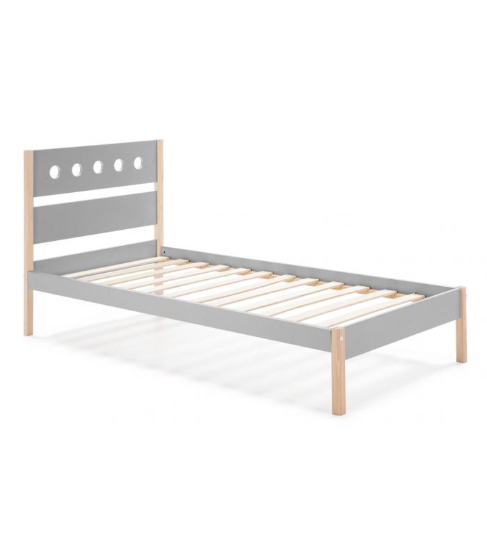 Fabricada en DM y madera de pino, combinando a la perfección el acabado de madera natural en las patas y gris claro en cabecero y laterales. Pensada para colchón de 90x190,