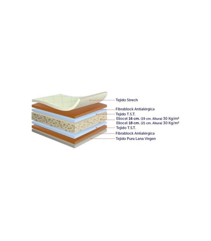 El colchón HR Ortopédico Lana de 19 cm. está compuesto en su interior por un bloque de eliocel HR de estructura celular abierta que proporciona una excelente transpirabilidad. Su exterior está compuesto por tejidos bien diferenciados, tejido strech a una cara para el verano y un tejido de pura lana virgen para el invierno.