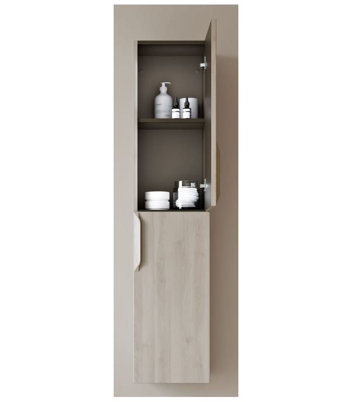 La columna de baño Urban es un modelo con diseño exclusivo, moderno y elegante. Está pensado para utilizar a diario, ya que cuenta con sistema de cierre progresivo, para no estropear las puertas, así no pegará golpe al cerrarlo. Los tiradores están integrados en el frente, ya que se recubre con el mismo material para conseguir sensación de pieza única. El interior está compuesto por 2 estantes móviles y 1 estante fijo en madera, para poner multitud de productos que tenemos en el baño, peine, crema... El interior está fabricado en acabado textil gris.