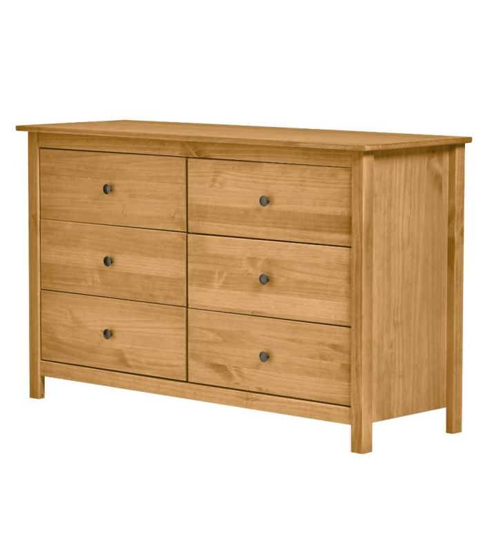 Cómoda de dormitorio Berna, fabricada en madera de pino maciza, barnizada en acabado cera. Su estilo clásico, provoca una sensación de tranquilidad esencial para cualquier estancia de dormitorio. Se compone de 6 Cajones perfectos para almacenaje de objetos de uso cotidiano. Combinable con los demás productos de la colección Berna.