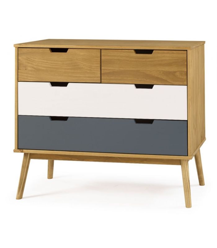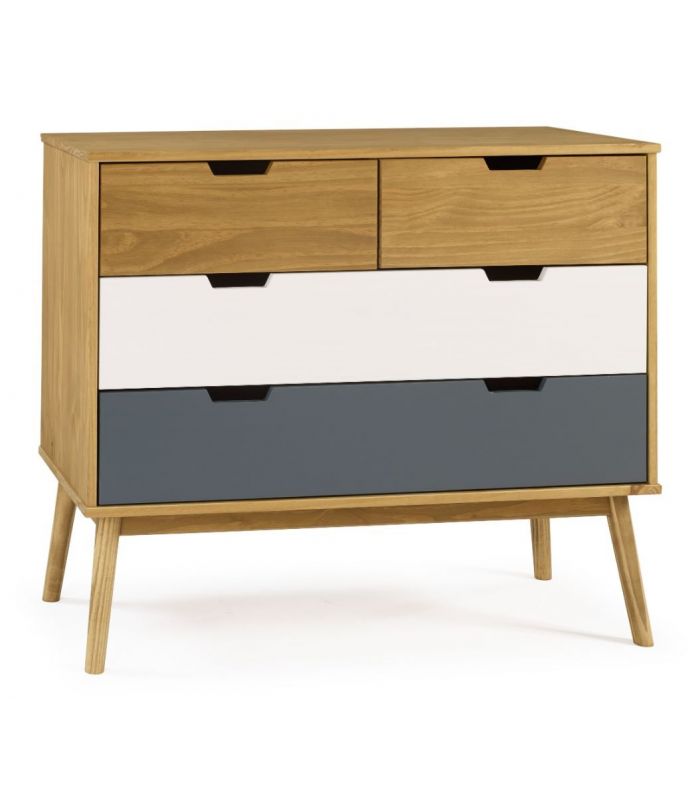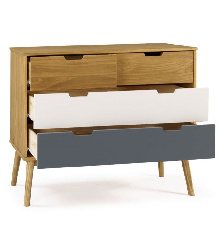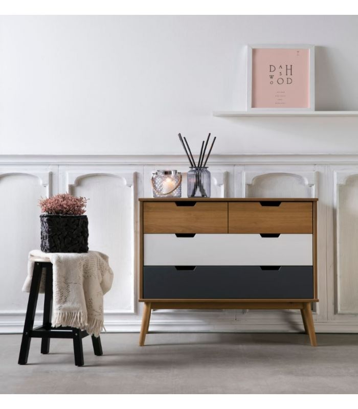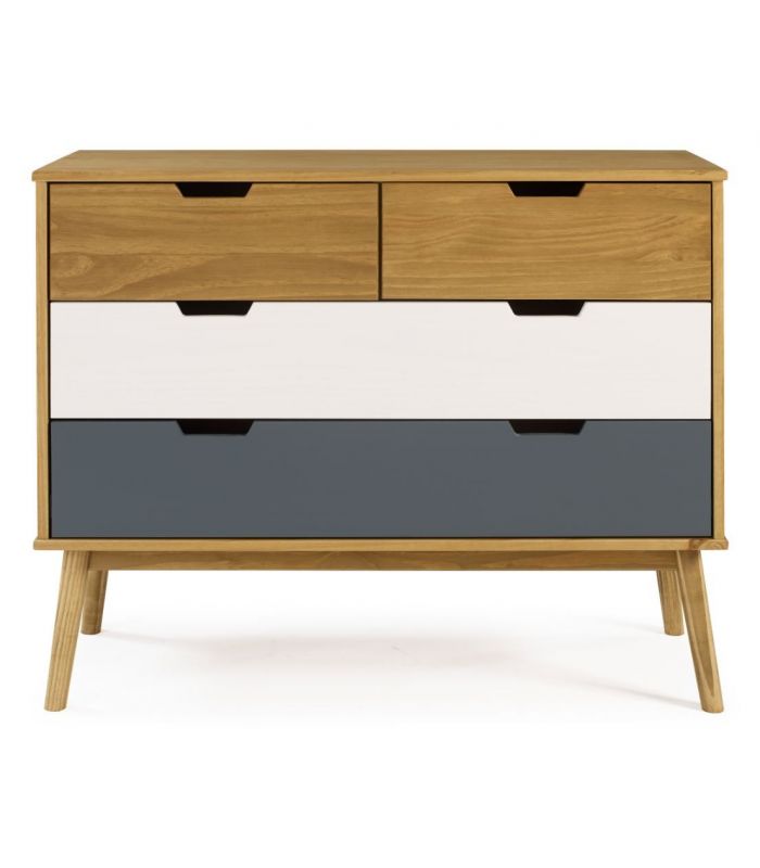 fabricada en madera de pino, combinado en acabado cera, gris antracita y blanco, donde se puede ver la veta de la propia madera. Ideal para combinar en ambientes donde se quiera dar sensación elegancia y sofisticación, con unos acabados impecables.