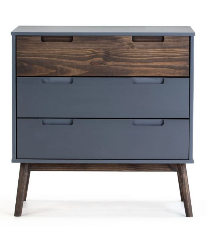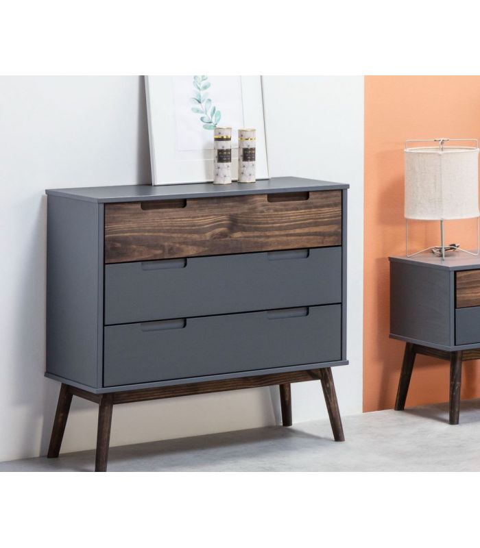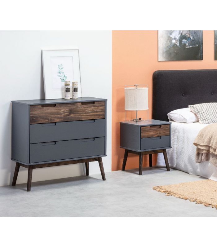 fabricada en pino lacado color antracita, combinado con frente de cajón y estructura en pino acabado cera oscura, donde se aprecia la veta de la propia madera. Ideal para combinar en ambientes de matrimonio y juveniles, es versátil gracias a sus acabados, con terminaciones elegantes, fácil de combinar.