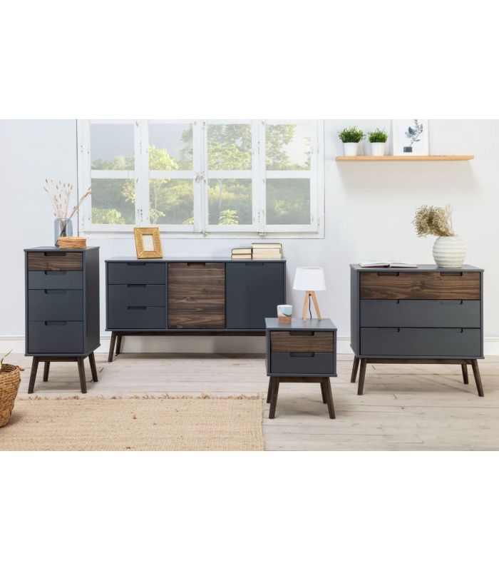 fabricada en pino lacado color antracita, combinado con frente de cajón y estructura en pino acabado cera oscura, donde se aprecia la veta de la propia madera. Ideal para combinar en ambientes de matrimonio y juveniles, es versátil gracias a sus acabados, con terminaciones elegantes, fácil de combinar.