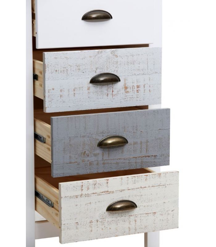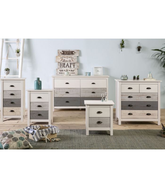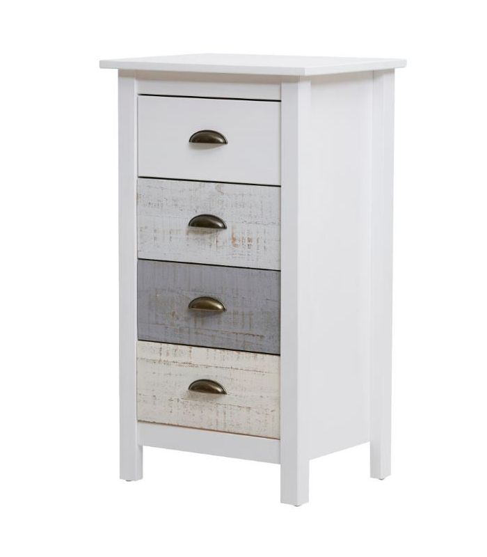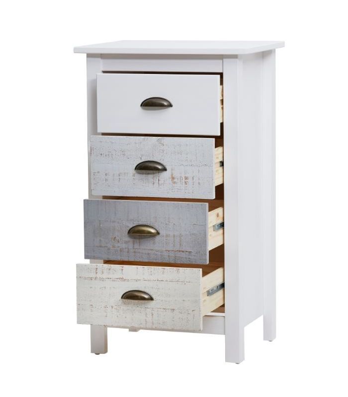 Sinfonier Romántica, fabricado en madera de pino, en color blanco combinado con tonos multicolor. Ideal para entornos donde se desee crear un ambiente actual, con un toque romántico. Tiradores metálicos en bronce, de fácil apertura. Compuesto por 4 cajones de gran capacidad ideales para utilizar de almacenaje.