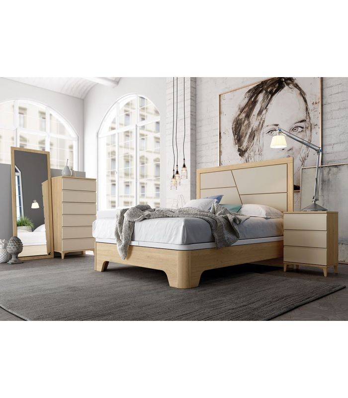 El Dormitorio Gina Roble Perla (2) está compuesto por cabezal para somier 135/150, 2 mesitas de 3 cajones con patas y sinfonier con patas y espejo. El canapé no está incluido (consultar). Se puede ampliar mobiliario (comodín, sinfonier, armarios...).