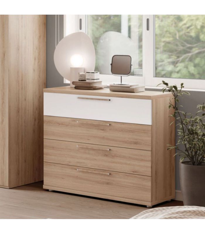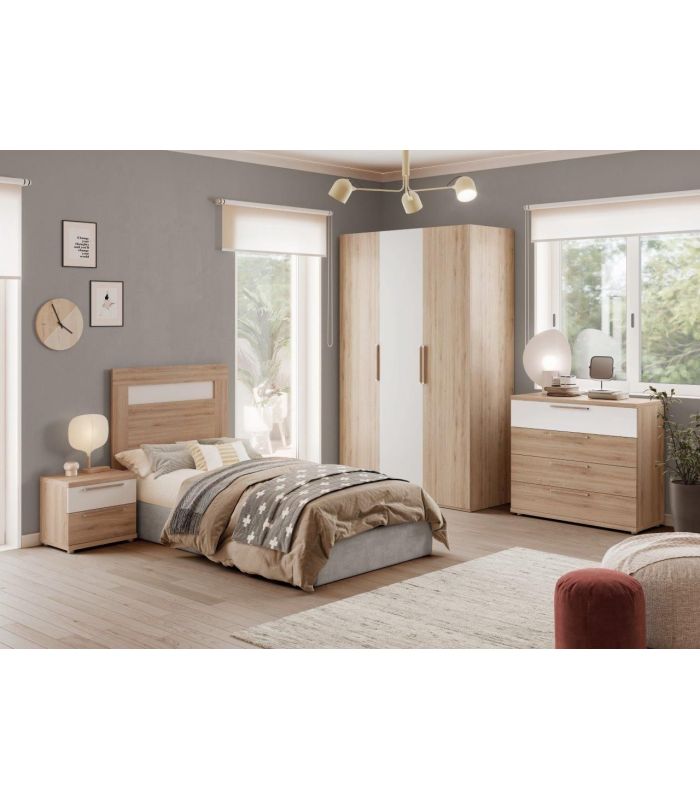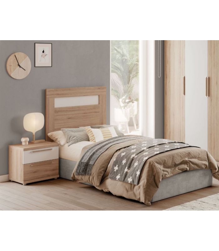 El Dormitorio Juvenil Krona, está compuesto por Cabecero y Mesita de 2 Cajones, cuenta con la opción de añadir armario y cómoda. El cabecero es de líneas rectas para dar un toque moderno y actual a la estancia. Fabricado en acabado Roble Natural/Blanco, con materiales de primera calidad, de fabricación nacional.