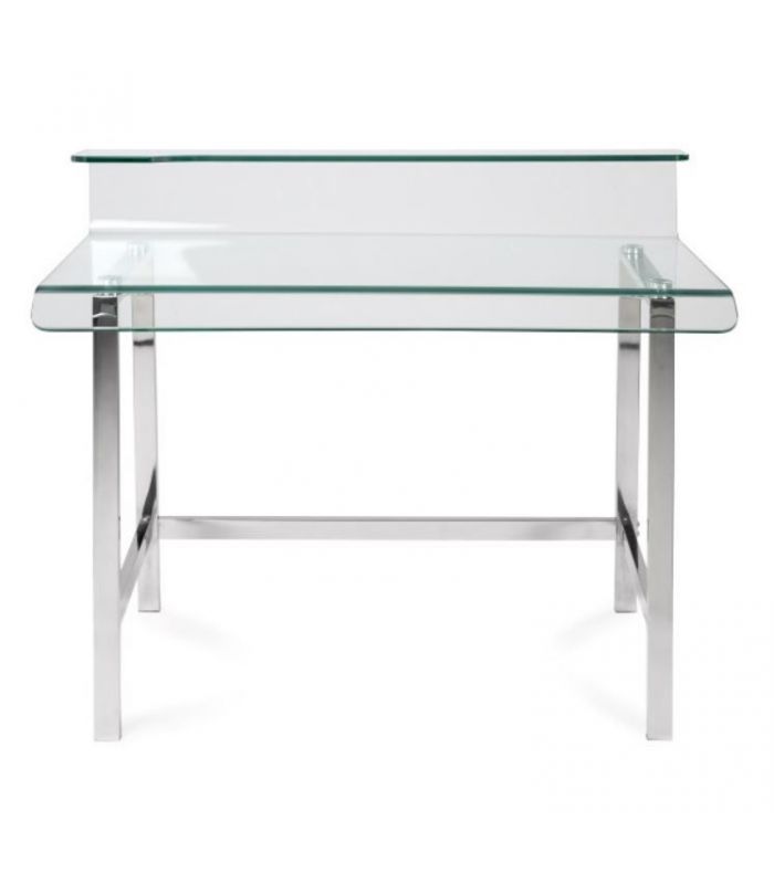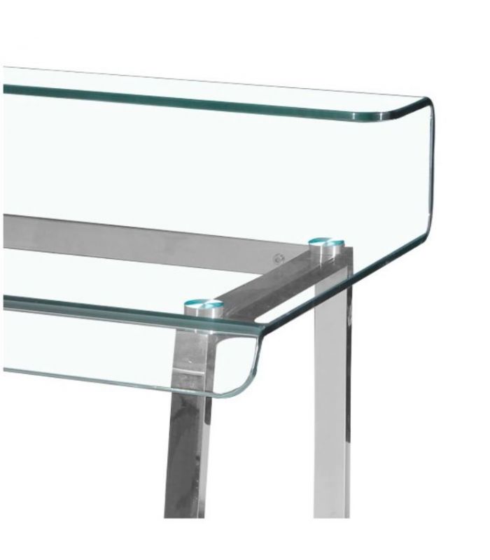 Mesa de estudio con estante, la tapa está fabricada en cristal templado, tiene forma peculiar, ya que se eleva en la parte trasera creando un estante, para poder poner multitud de objetos de uso diario. En la parte inferior, también tiene forma curva para un mayor confort, ya que así los brazos descansarán de manera cómoda. Es una mesa que llama la atención allá donde se encuentre, ideal para cualquier estancia en la que se quiera dar un toque especial, oficinas, estudios, dormitorio juvenil, dormitorio matrimonio, incluso en salones.