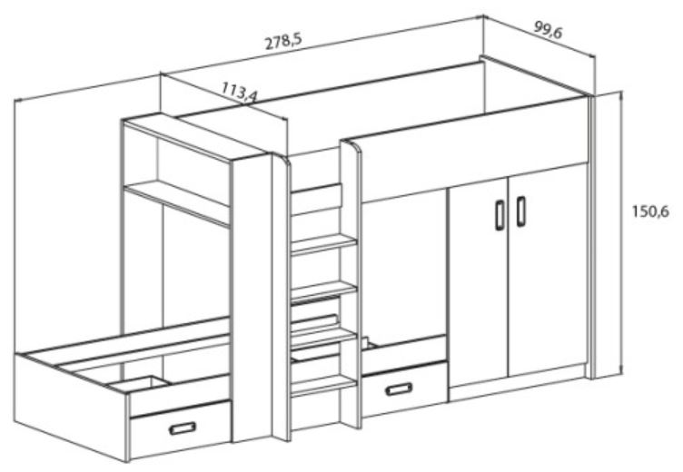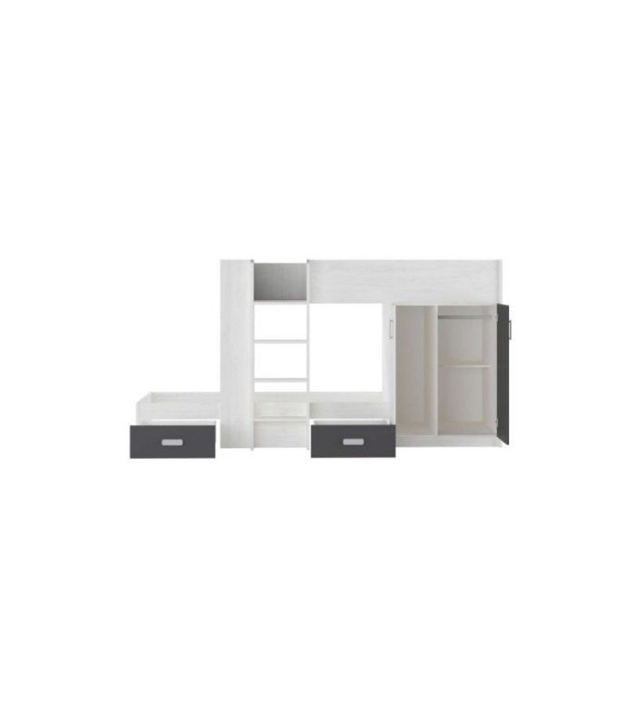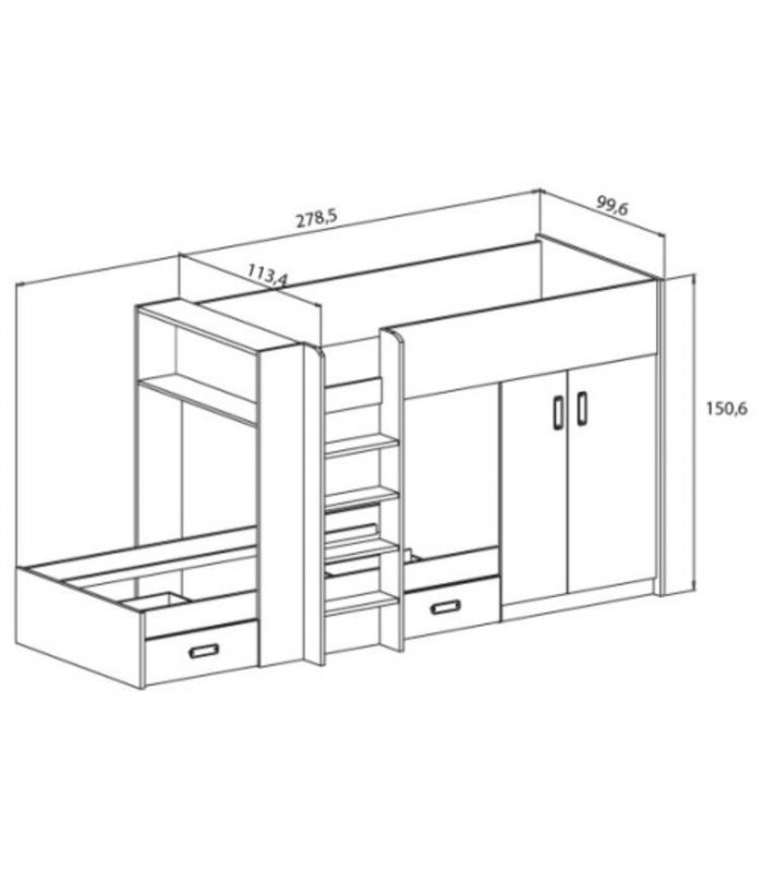cama alta, de 90x190 cm., y Cama baja de 90x190 cm., y dos cajones. Además, lleva implementado un pequeño armario donde colocar todo lo que necesites. Como detalle, en la parte superior de la cama, en un lateral, incluye un estante donde poder colocar todo tipo de objetos, a nivel decorativo, o algunos libros, etc.