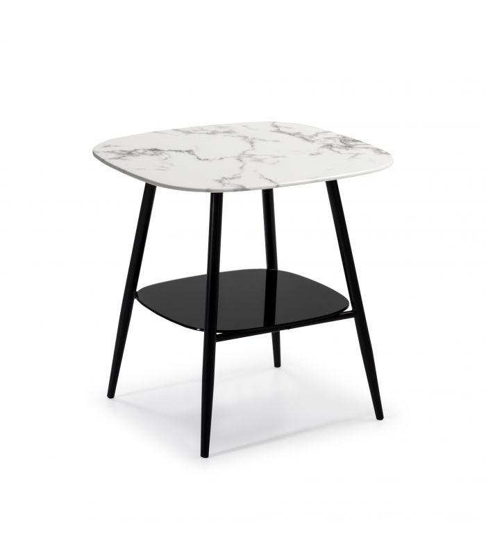 Mesa Rincón Alina, fácil de combinar en diferentes ambientes gracias a los materiales con los que está fabricada, ya que la tapa es cristal imitación Mármol Marquina, sobre estructura metálica con cuatro patas en negro. En la parte inferior cuenta con estante en cristal negro, que combina a la perfección con el acabado de las patas.