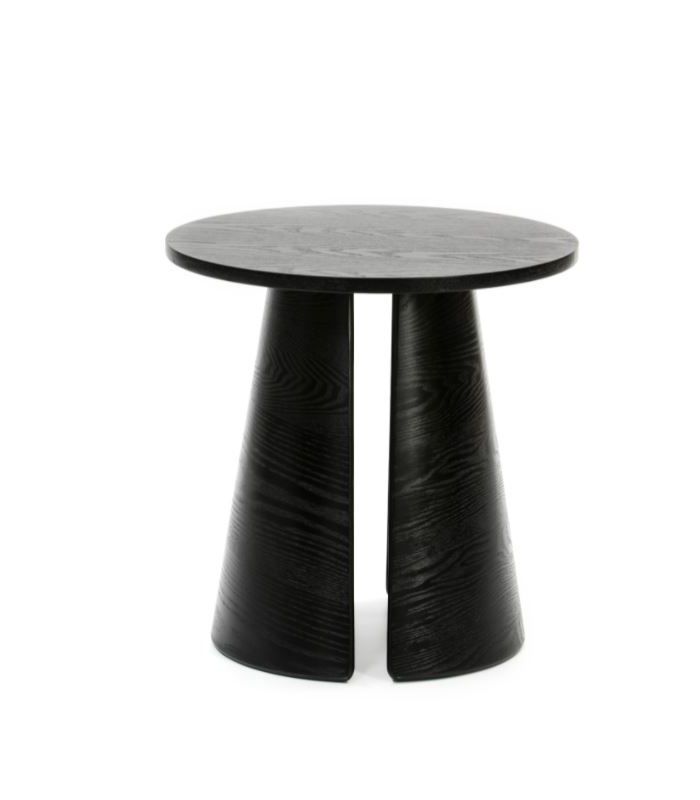 Mesa Rincón Auxiliar Cep,  Esta mesa destaca por su diseño simple. Tanto las patas como la tapa están fabricadas en DM con acabado en madera de fresno con acabado en color negro. La colección Cep es sencilla y minimalista, donde se busca sacar el máximo rendimiento al proceso de construcción de las piezas: el curvado de las maderas.  Está disponible en varios colores.