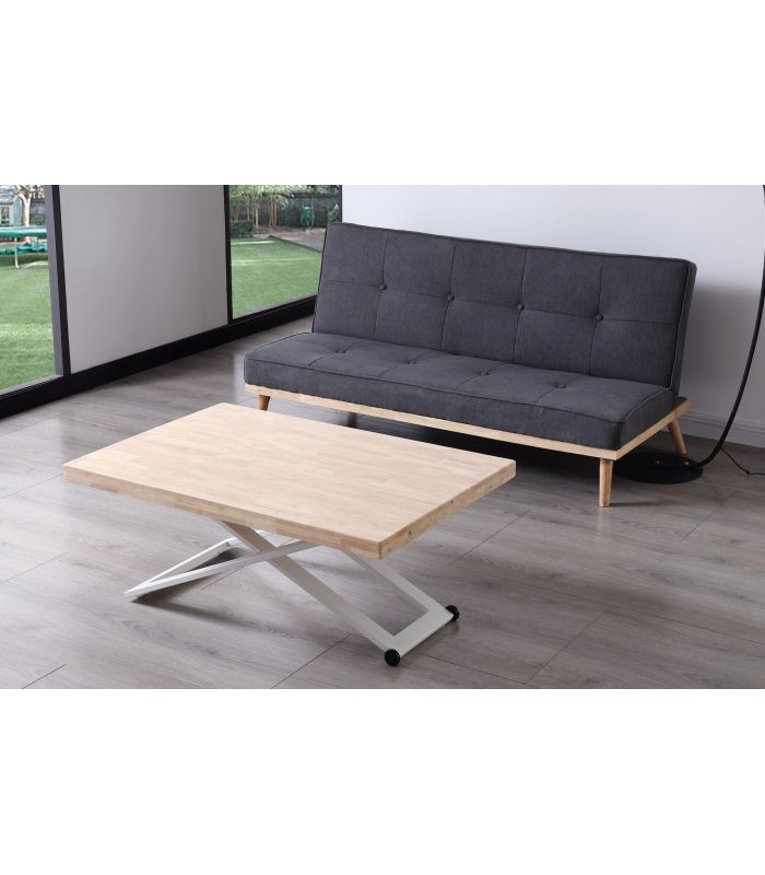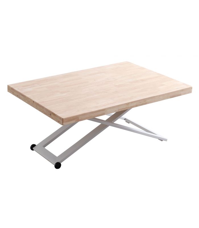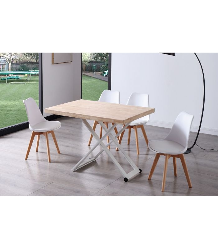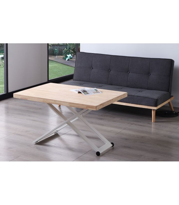 Mesa de Centro Zoe elevable, con tapa en Roble natural, acabado Nordish, ideal para poder elevar y utilizar como mesa de comedor. Sus patas metálicas en color blanco en forma de X ofrecen a este diseño un resultado espectacular, que gracias a sus acabados tiene un diseño único, definido por los materiales con los que está fabricada. Tiene una terminación de líneas rectas, con acabados pulidos. Sus patas cuentan con conteras antirayado, para no dañar el pavimento.