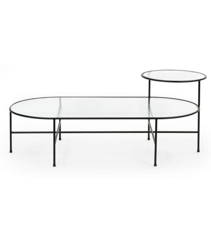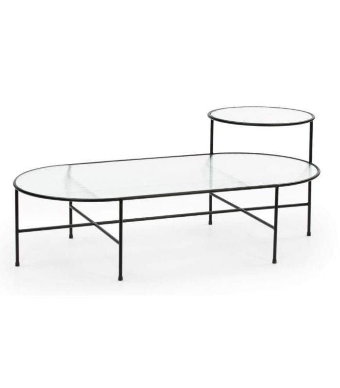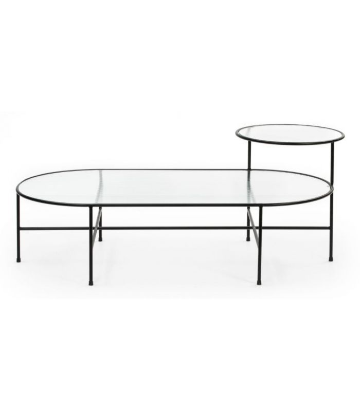Mesa de centro Nix, Es una mesa que destaca por su diseño sencillo y original. Está compuesta por una estructuta de hierro macizo lacado con acabado en color negro donde se apoyan dos sobres de cristal estriado con acabado transparente. La colección Nix superpone las texturas de sus cristales situados a distintas alturas.