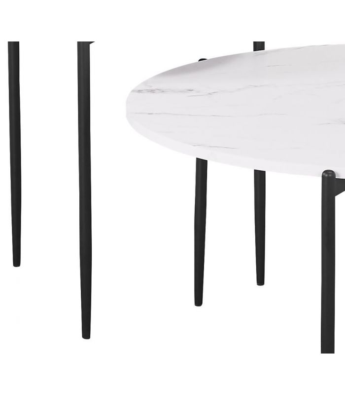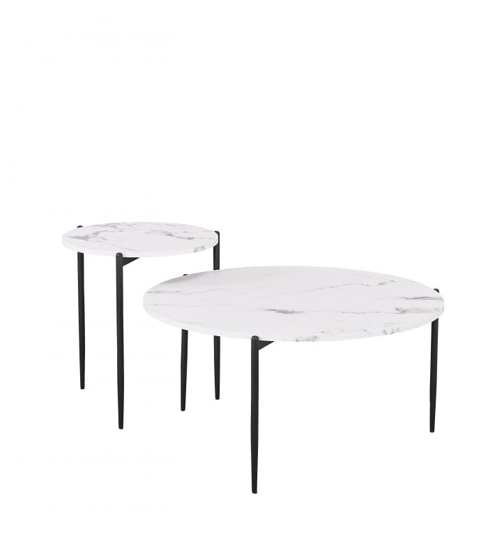 Conjunto de dos mesas auxiliares Everol, fabricadas en MDF con acabado imitación mármol blanco, cuenta con diseño moderno y actual, con mucha personalidad, ideal para combinar en ambientes de comedor, salas de espera... La tapa está sobre una estructura metálica en color negro. Podrás crear ambientes con mucho estilo. Podrás usarlas a modo decorativo, para poner multitud de objetos.