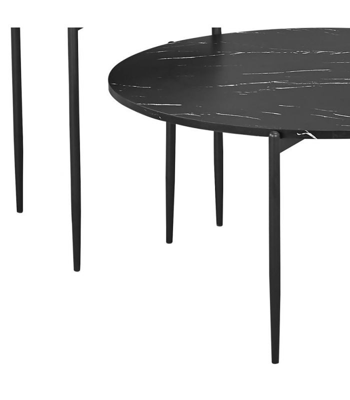 Conjunto de dos mesas auxiliares Eve, fabricadas en MDF con acabado imitación mármol negro, cuenta con diseño moderno y actual, con mucha personalidad, ideal para combinar en ambientes de comedor, salas de espera... La tapa está sobre una estructura metálica en color negro. Podrás crear ambientes con mucho estilo. Podrás usarlas a modo decorativo, para poner multitud de objetos.