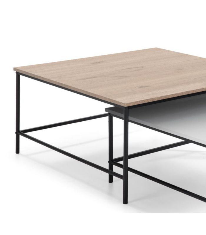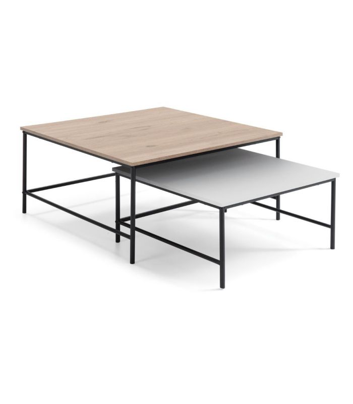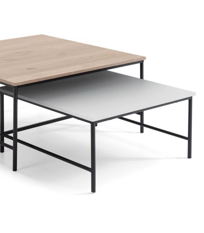 Set 2 Mesas Centro Fiorenza, fácil de combinar en diferentes ambientes gracias a los materiales con los que está fabricada, cada tapa tiene un acabado diferente, están fabricada en DM acabado Sahara/Blanco, con cantos rectos. Su estructura de 4 patas está fabricada en metal color negro, con travesaños para darle más fuerza y estabilidad. Las patas cuentan con conteras antirayado para no estropear el pavimento.