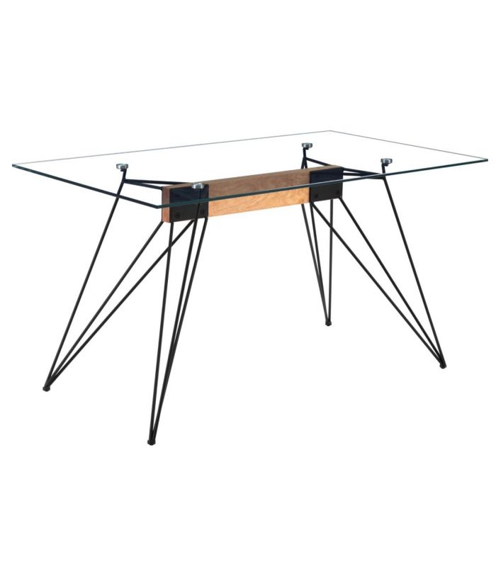 Está fabricada con materiales de primera calidad y se compone de tablero en cristal templado con acabado transparente y patas de metal con acabado en color negro, además consta de un travesaño central de madera que hace de unión entre las patas. El tablero está termosellado a la estructura por lo que le proporciona seguridad y estabilidad.