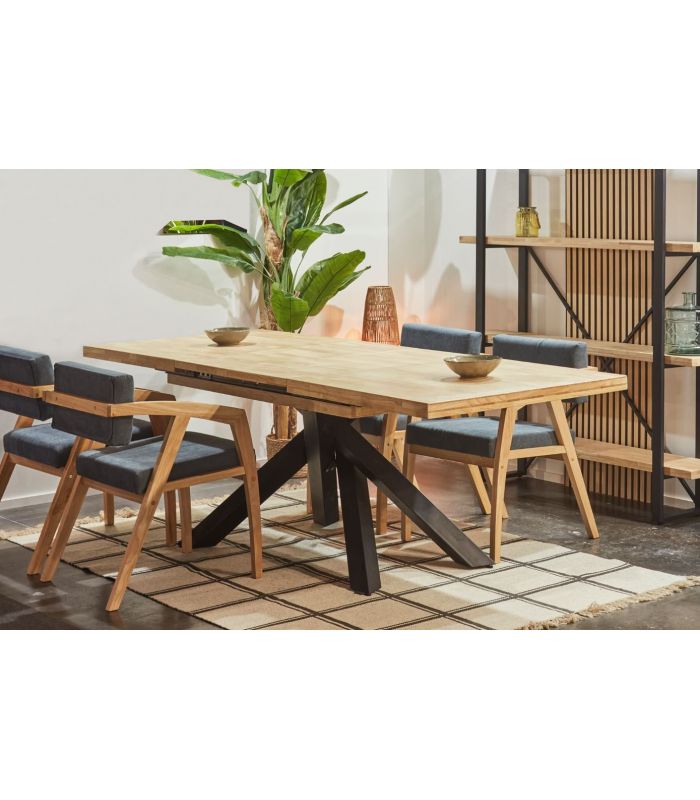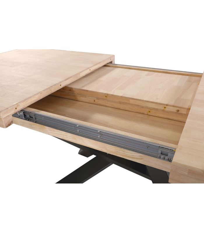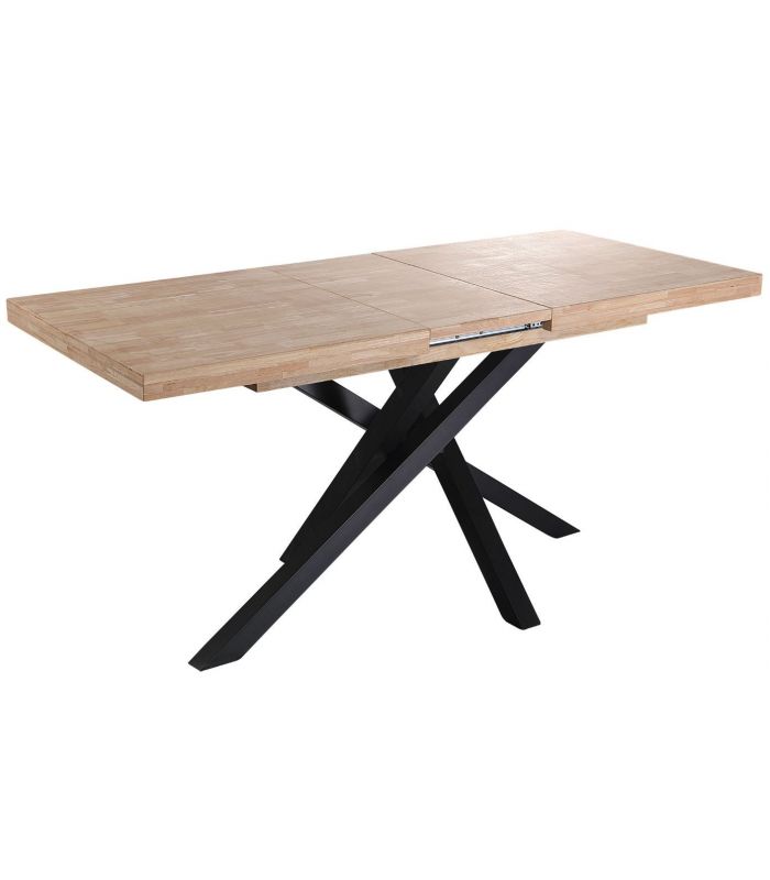 Mesa de Comedor Extensible Xena tiene la tapa fabricada en Roble natural, acabado Nordish. Sus patas metálicas en color negro entrecruzadas, hacen de este mesa una estructura espectacular, unidas en el centro por un cuadrado de metal y madera de roble aportando mayor estabilidad. Cuenta con diseño único, definido por sus acabados. Este modelo tiene una terminación de líneas rectas, con acabados pulidos. Sus patas tienen conteras antirayado, para no dañar el pavimento.