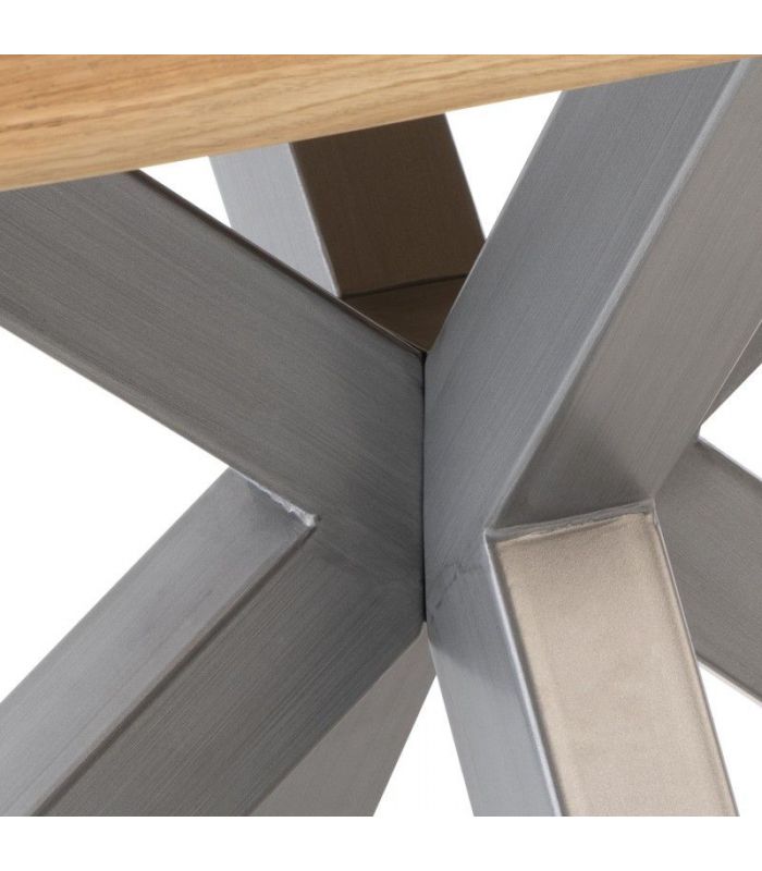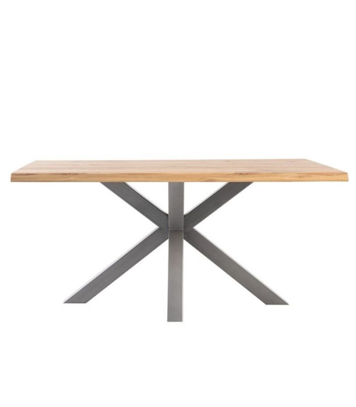 Mesa Comedor Grace, compuesta por tapa de madera maciza de roble de 40 mm de grosor con acabado natural y patas de metal  entrecruzadas con acabado en color cromo. Destaca por el diseño de las patas que le aporta un toque de originalidad y se adapta a la perfección a cualquier ambiente. Disponible en varios colores.