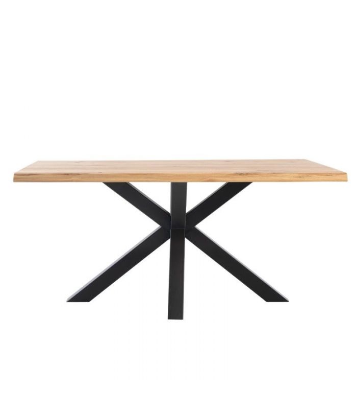 Mesa Comedor Grace, compuesta por tapa de madera maciza de roble de 50 mm de grosor con acabado natural y patas de metal  entrecruzadas con acabado en color negro. Destaca por el diseño de las patas que le aporta un toque de originalidad y se adapta a la perfección a cualquier ambiente. Disponible en varios colores.