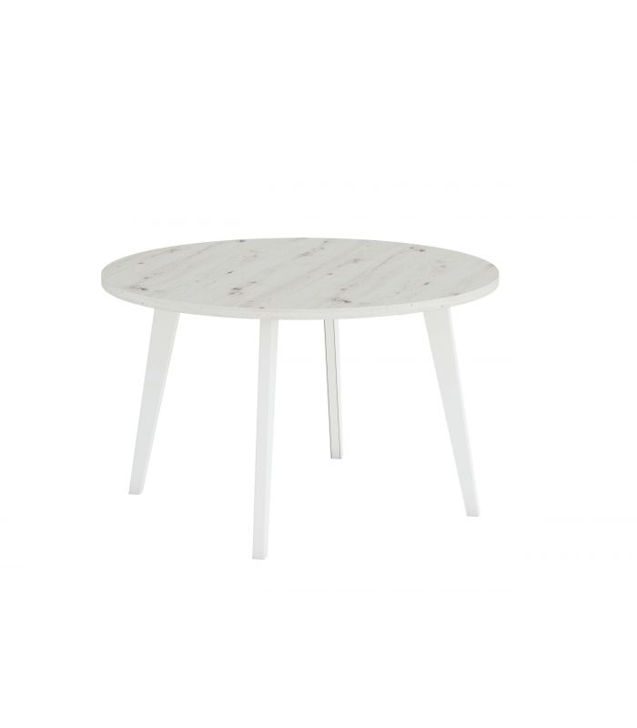 Mesa Comedor kim, con tapa redonda fabricada en material laminado de primera calidad. Sus patas son metálicas inclinadas hacia el exterior en color blanco. Kim, es una gran colección, con varias composiciones de salón, y aparadores, perfectamente combinables con esta mesa. También la podrás combinar con la colección Fred, Mila, Carla...