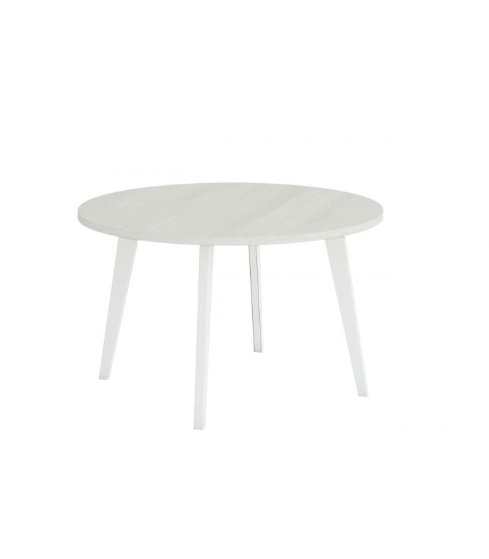 Mesa Comedor kim, con tapa redonda fabricada en material laminado de primera calidad. Sus patas son metálicas inclinadas hacia el exterior en color blanco. Kim, es una gran colección, con varias composiciones de salón, y aparadores, perfectamente combinables con esta mesa. También la podrás combinar con la colección Fred, Mila, Carla...