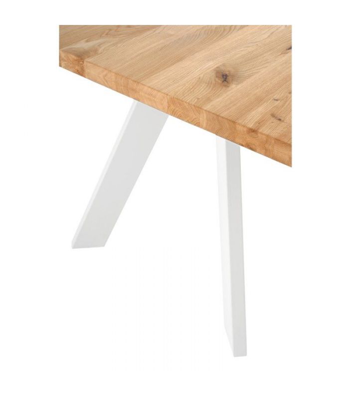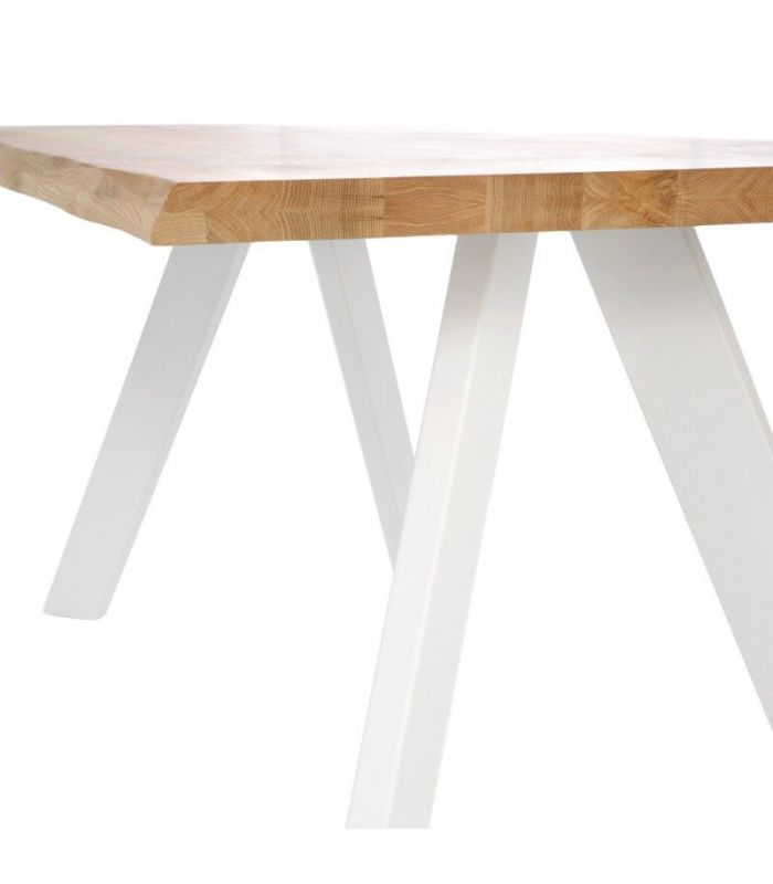 Mesa Comedor Lucina, compuesta por tapa de madera de roble de 40 mm de grosor con acabado natural y patas de metal con acabado en color blanco. Destaca por el diseño de las patas que le aporta un toque de originalidad y se adapta a la perfección a cualquier ambiente. Disponible en varios colores.
