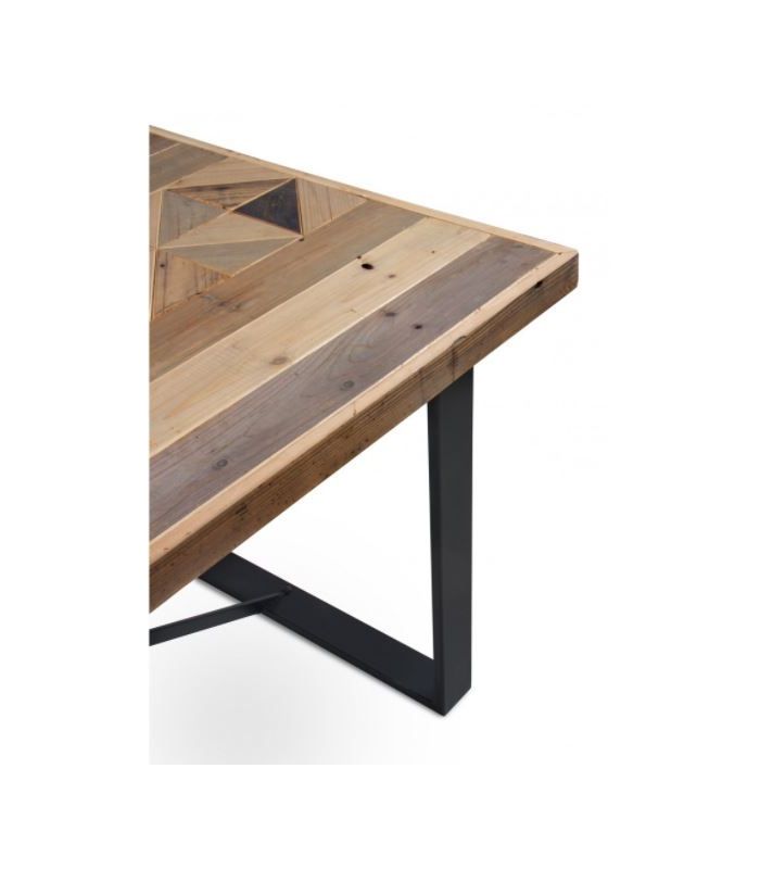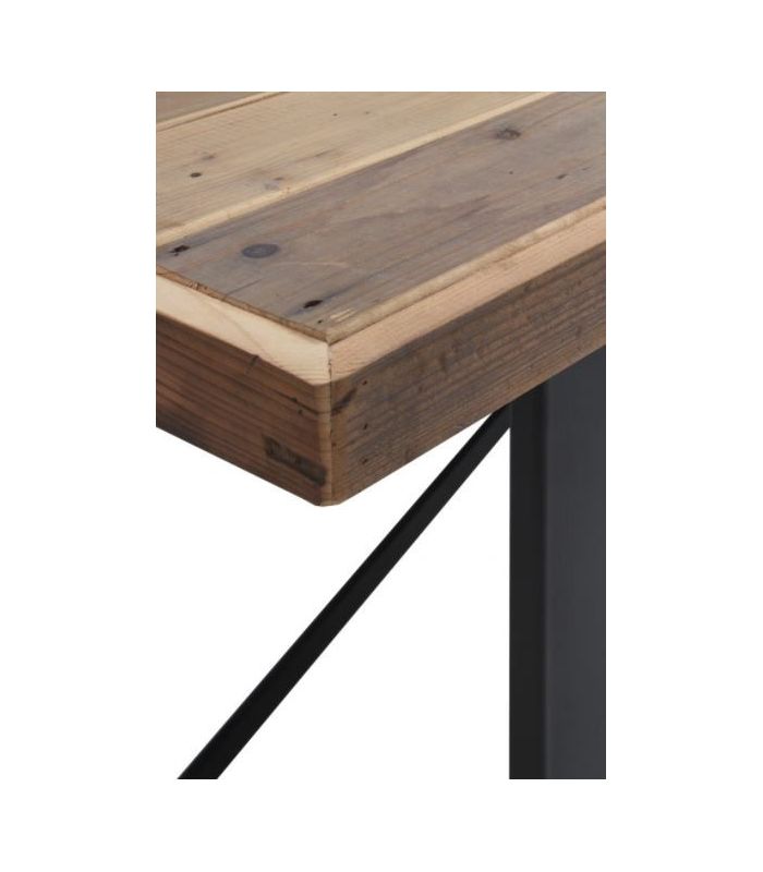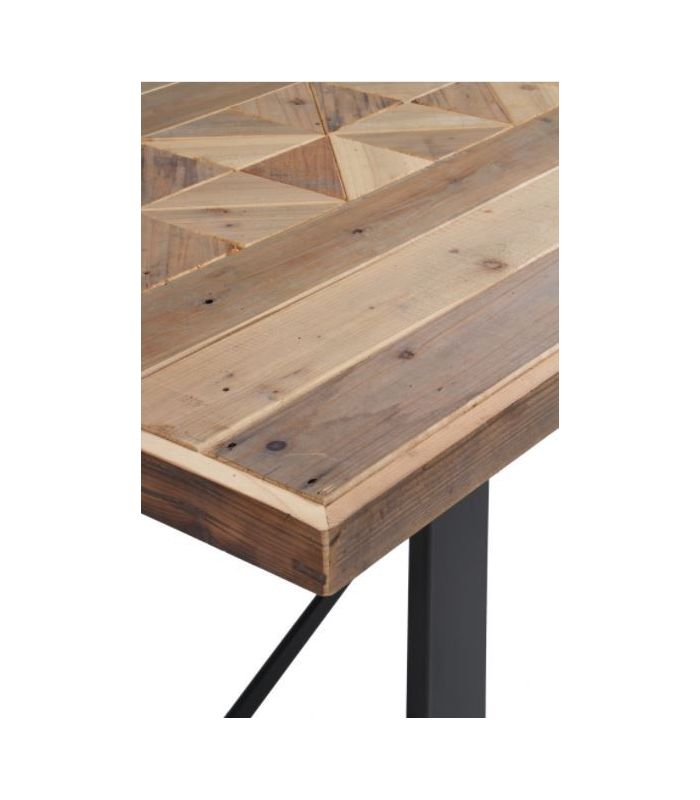 Está compuesta por tablero de MDF chapado en madera de fresno con lamas de madera reciclada en diferentes colores y patas de metal con acabado en color negro.
