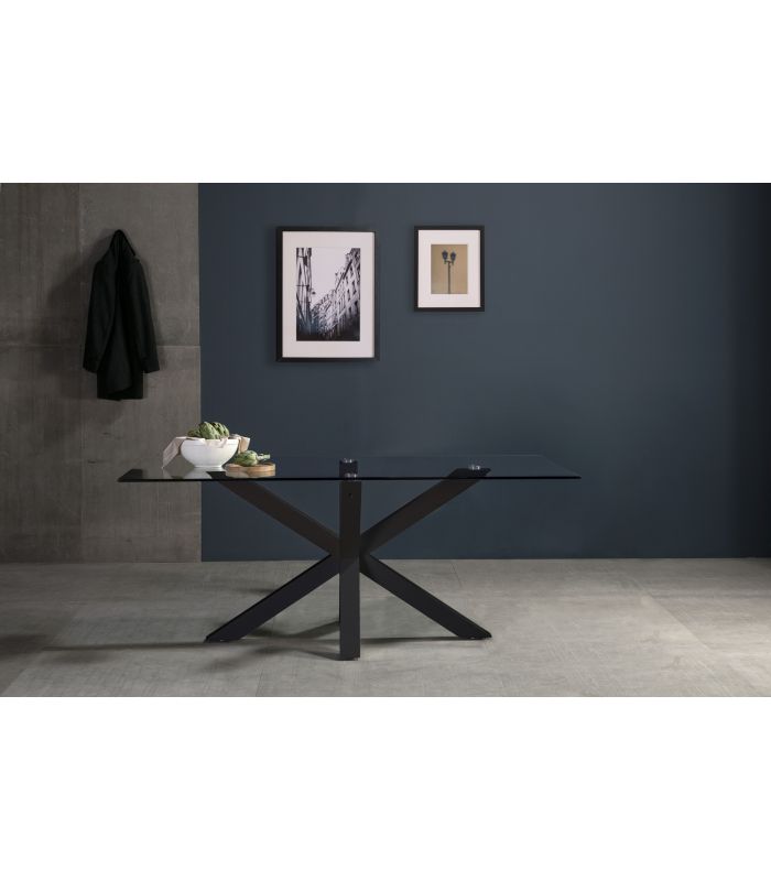 Mesa de Comedor Paula de grandes dimensiones, con un acabado único, ya que sus patas en metal color negro, aportan a la estancia un toque único, con gran resistencia y durabilidad ya que están entrecuzadas, hacen de este mesa una estructura espectacular. Con tapa en cristal templado, para hacer el espacio más diáfano. Cuenta con diseño único, definido por sus acabados. Sus patas tienen conteras antirayado, para no dañar el pavimento.