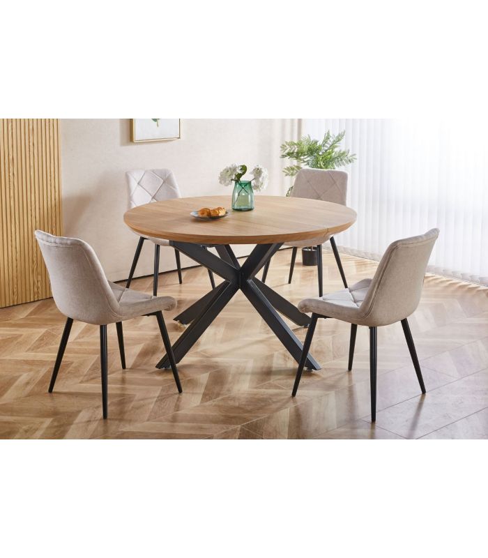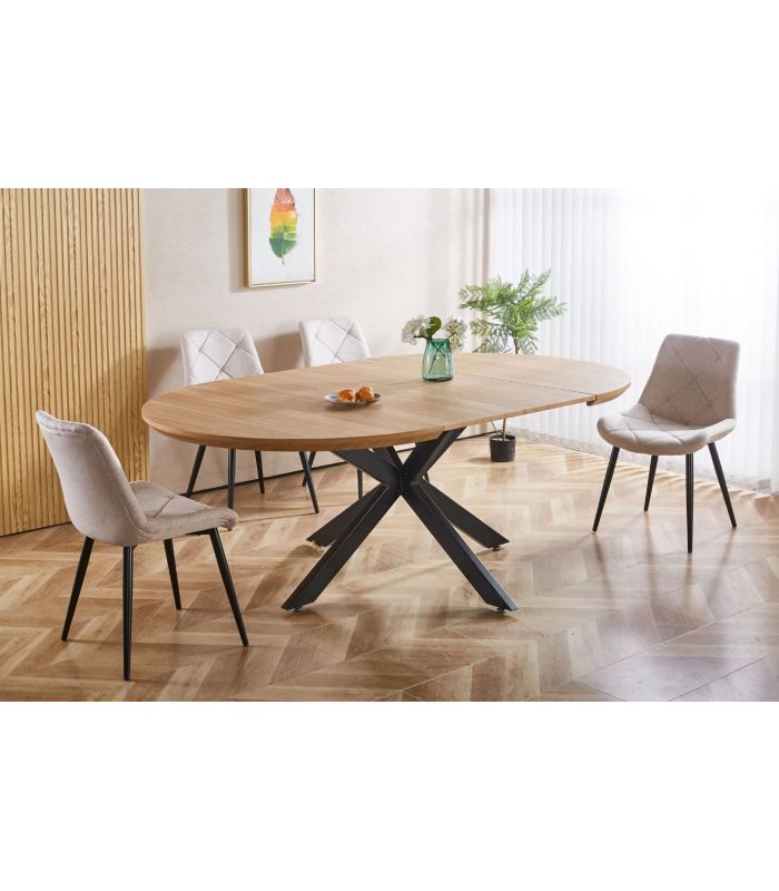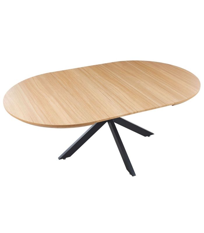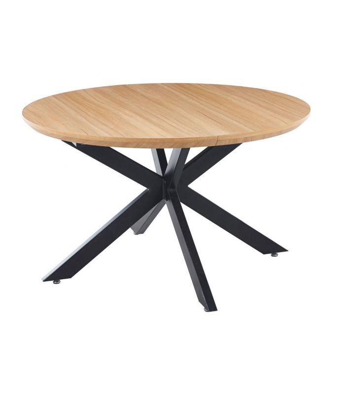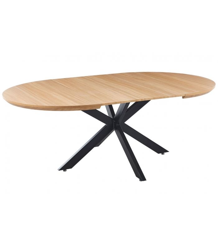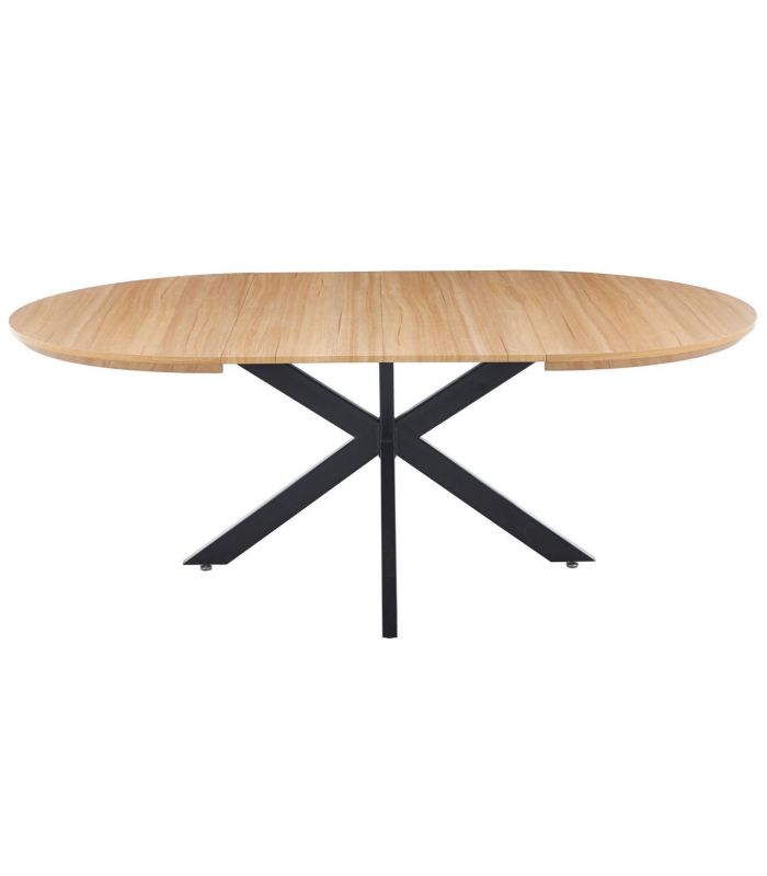 Mesa de Comedor Extensible Cross tiene la tapa fabricada en MDF y papel laminado de alta calidad, en acabado madera. Cuenta con patas metálicas unidas en el centro en color negro, aportando firmeza y resistencia. Su diseño es único, definido por sus acabados.