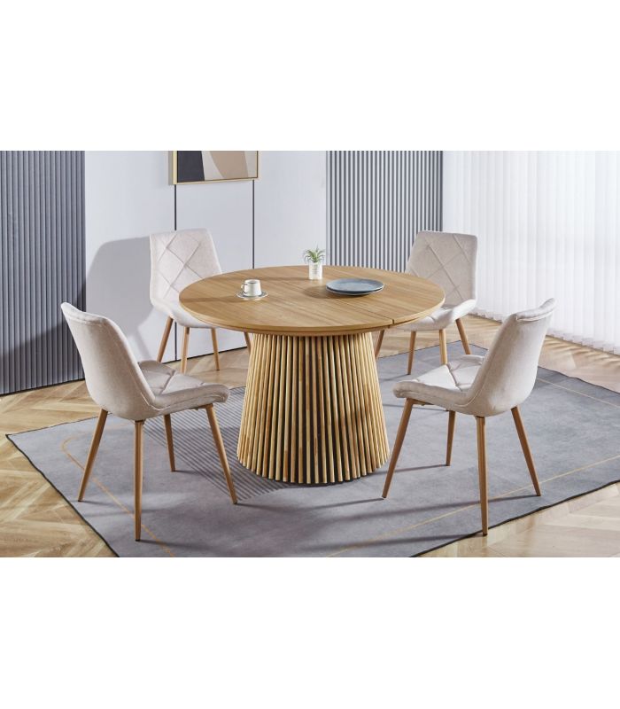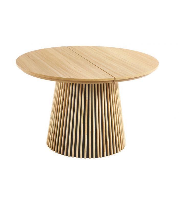 Mesa de Comedor Extensible Keanu tiene la tapa fabricada en MDF y papel laminado de alta calidad, en acabado madera. Cuenta con una pata central en forma de cono con palillera. Su diseño es único, definido por sus acabados.