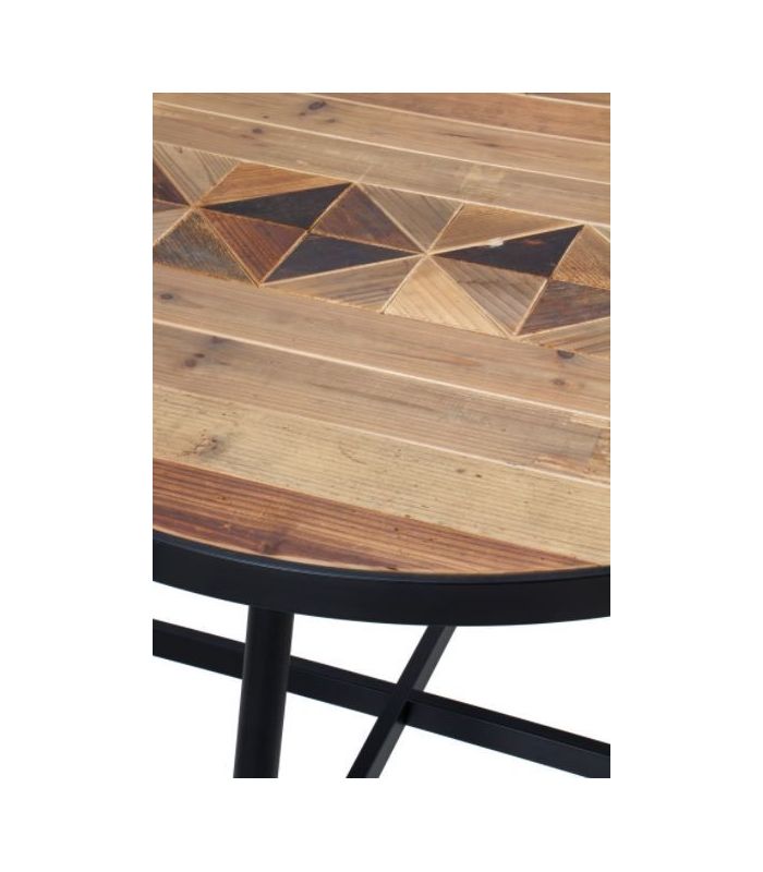 Está compuesta por tablero de MDF chapado en madera de fresno con lamas de madera reciclada en diferentes colores y patas de metal con acabado en color negro.