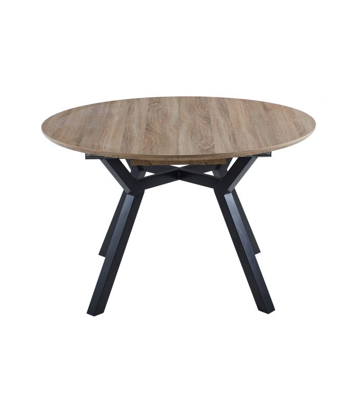 Mesa en DM lacado acabado Oak, con tapa redonda extensible tipo libro y terminación de líneas rectas, dando un resultado impecable. Sus patas son metálicas, en color Negro, unidas en el centro aportando fuerza y resistencia. En la terminación de las patas, tiene conteras antirayado para no estropear el pavimento. Delta tiene un diseño único, definido por sus acabados.