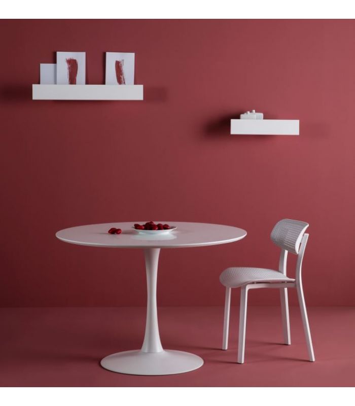 La mesa Oda tiene un diseño espectacular, ya que la tapa redonda está soportada por un pie único central con base circular en la parte inferior para darle firmeza y estabilidad. Está fabricada en DM y estructura metálica lacada en blanco mate, con un acabado único gracias a los materiales con los que está fabricada. Oda aportará a la estancia un toque diferente ya que cuenta con un diseño diferente definido por su sencillez y elegancia.