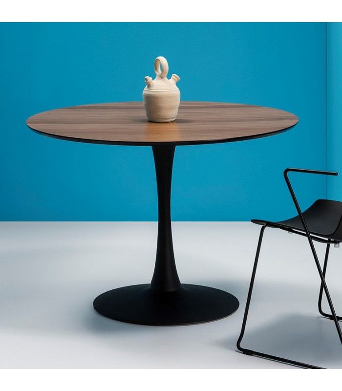 La mesa Oda tiene un diseño espectacular, ya que la tapa redonda está soportada por un pie único central con base circular en la parte inferior para darle firmeza y estabilidad. Está fabricada en DM Nogal y estructura metálica lacada en negro, con un acabado único gracias a los materiales con los que está fabricada. Oda aportará a la estancia un toque diferente ya que cuenta con un diseño diferente definido por su sencillez y elegancia.