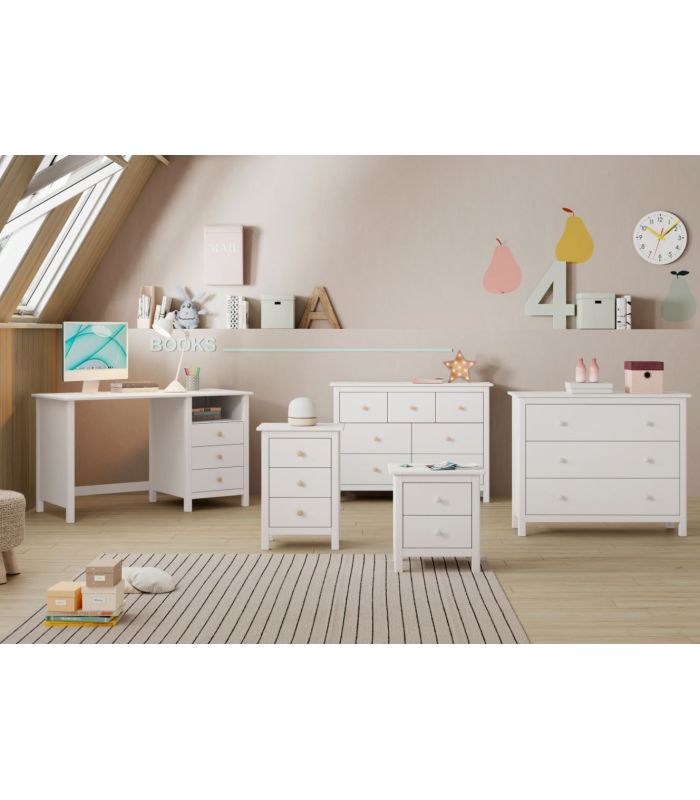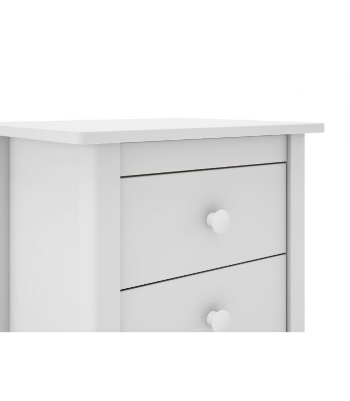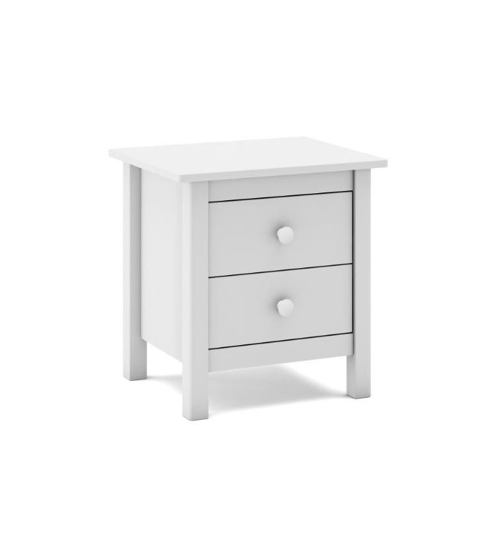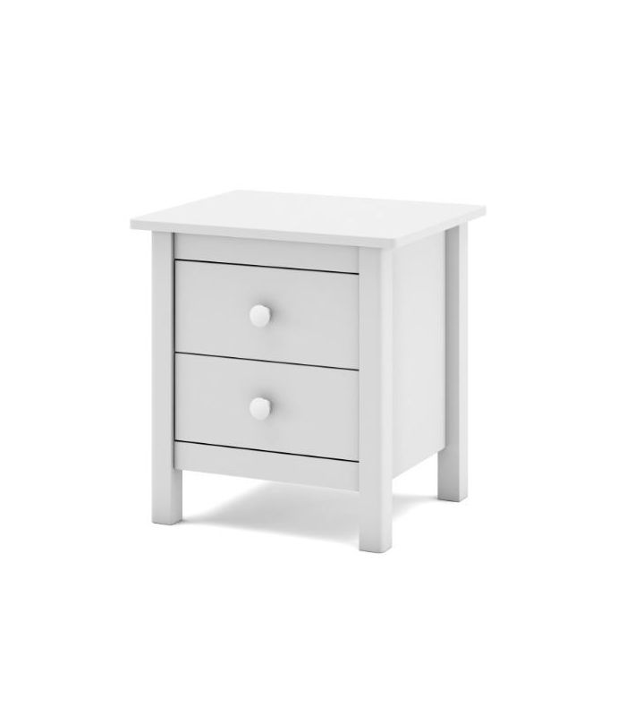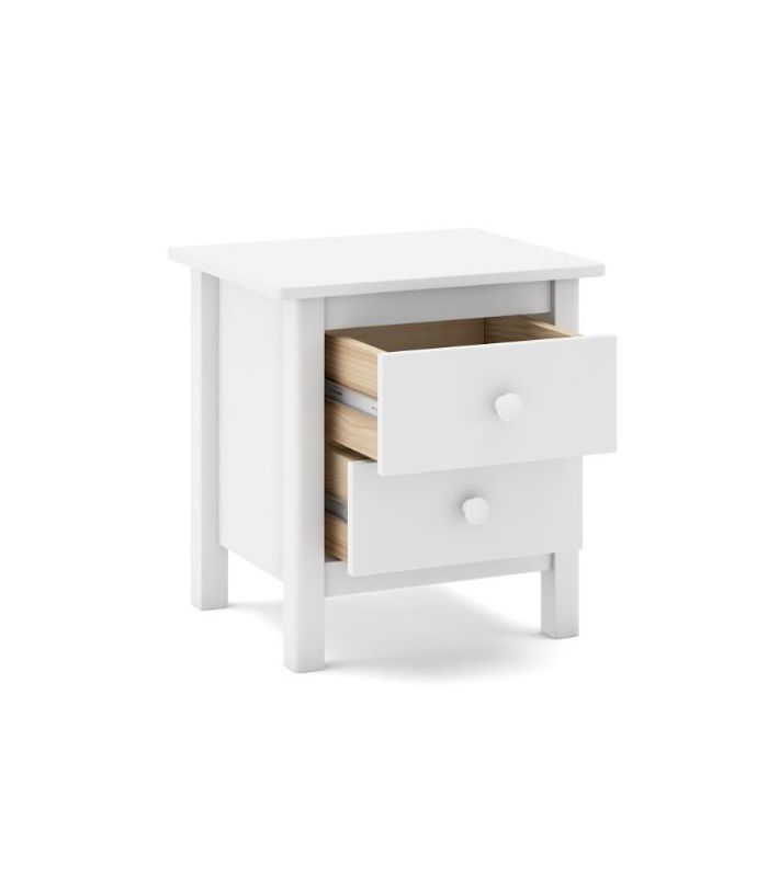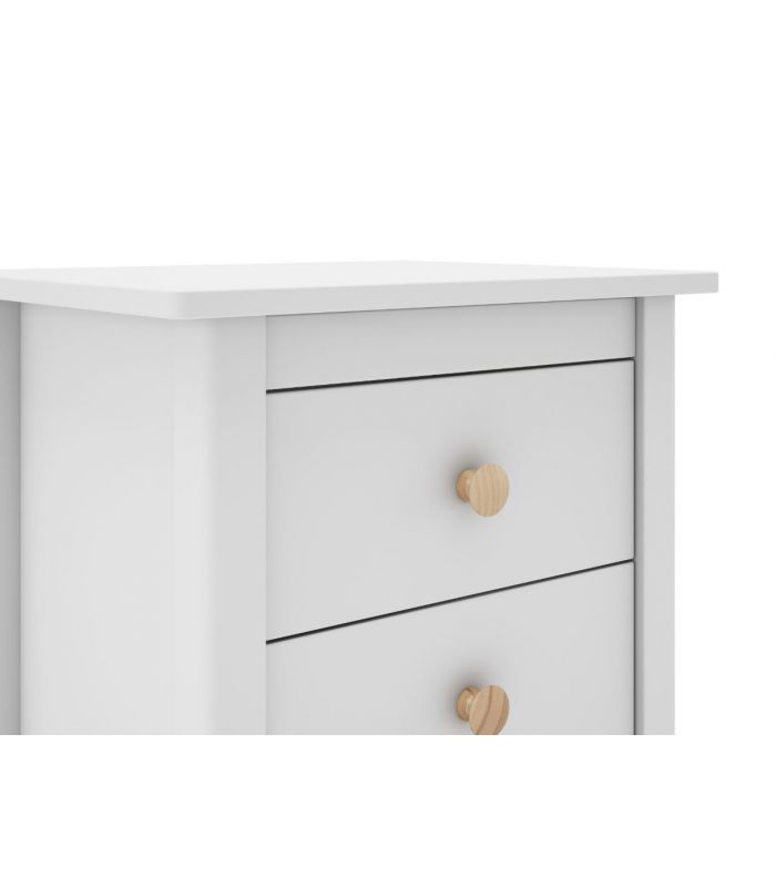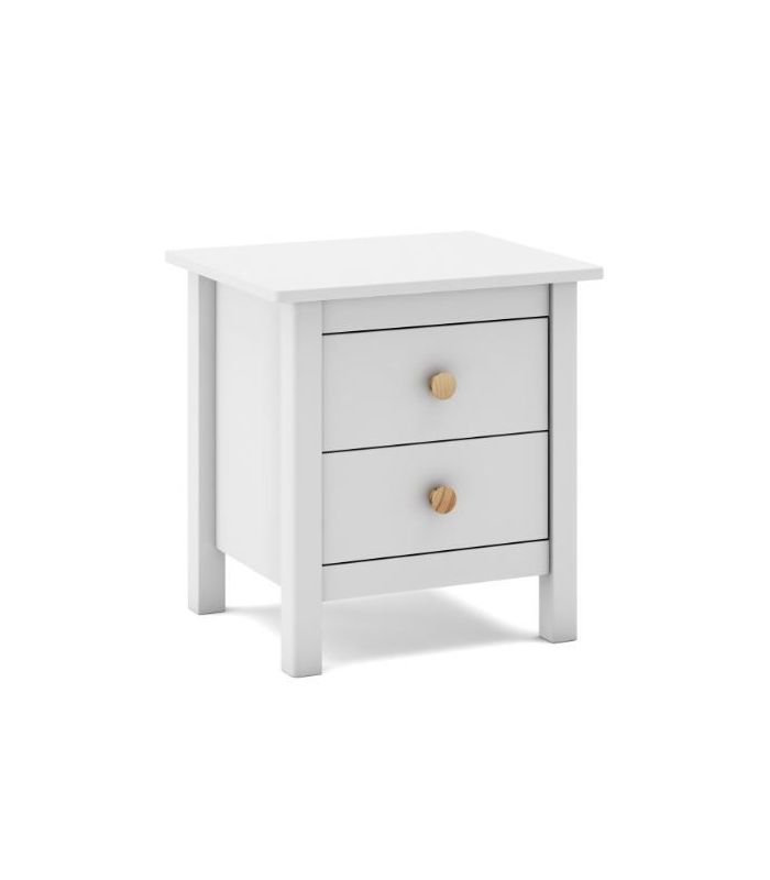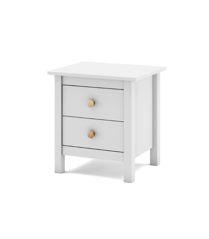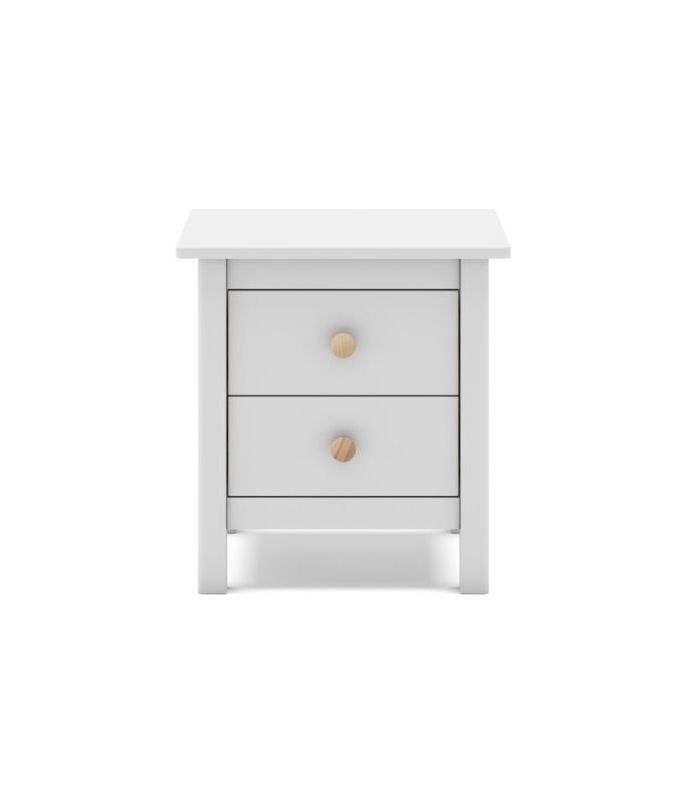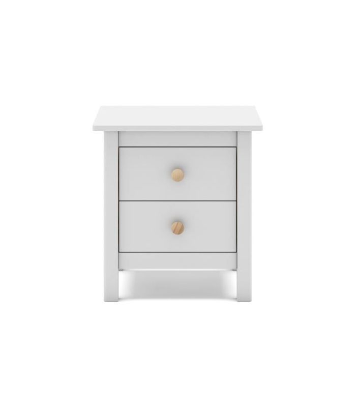 Mesita Max, fabricada en madera de pino maciza, pintada en blanco, compuesta de 2 cajonesperfectos para almacenaje de objetos de uso cotidiano. Su estilo clásico da sensación de tranquilidad esencial para cualquier estancia de dormitorio. Sus tiradores se pueden poner en blanco o madera. Combinable con los demás artículos de la colección Max.