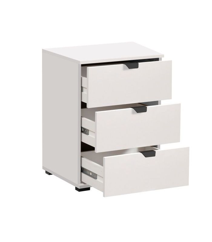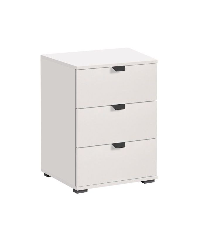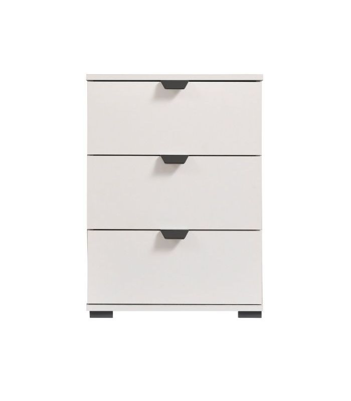 Mesita Durama, compuesta por 3 cajones de gran capacidad, fabricada en laminado sintético en acabado blanco mate, sus tiradores tipo uñero son de fácil apertura en color negro. Su diseño es sencillo y elegante, fácil de combinar gracias a sus acabados. Completa el dormitorio con la cómoda Dumara disponible en nuestra sección de dormitorios.