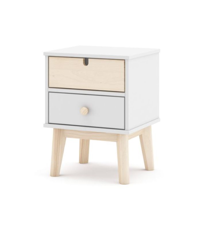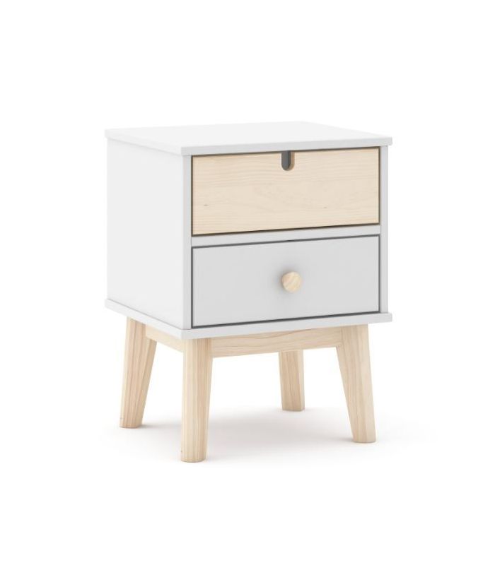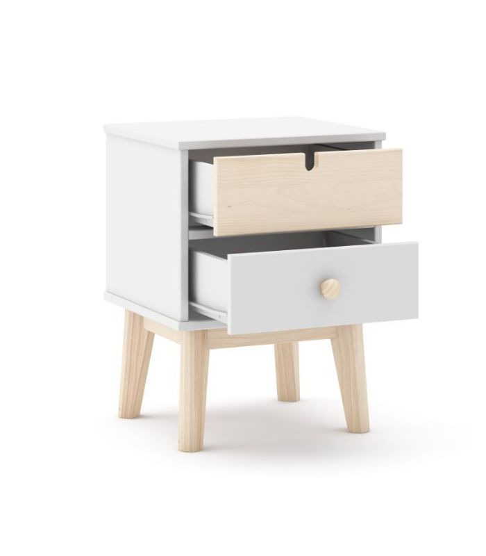 Mesita Estefanía, compuesta por 2 cajones, ideal para crear ambientes juveniles acogedores. Fabricada en madera de pino maciza con veta y DM lacado blanco. Su diseño es sencillo y elegante, fácil de combinar en multitud de ambientes, tanto para los peques de la casa, como para mayores. Combinable con los demás artículos de la colección.