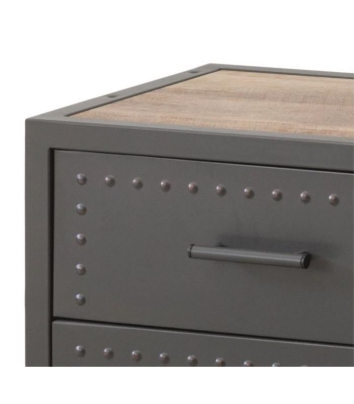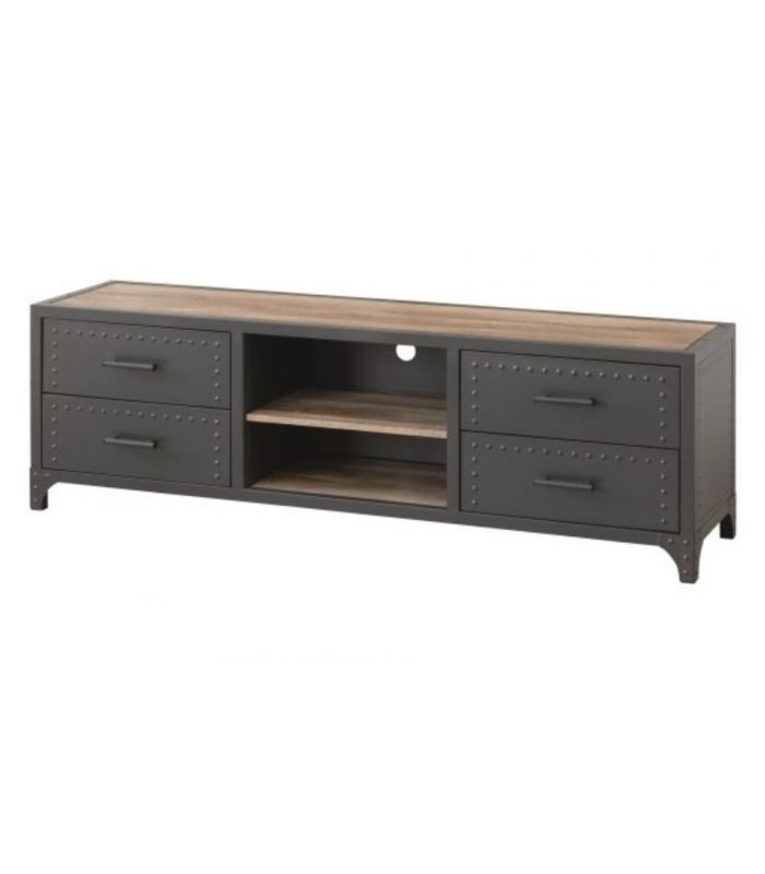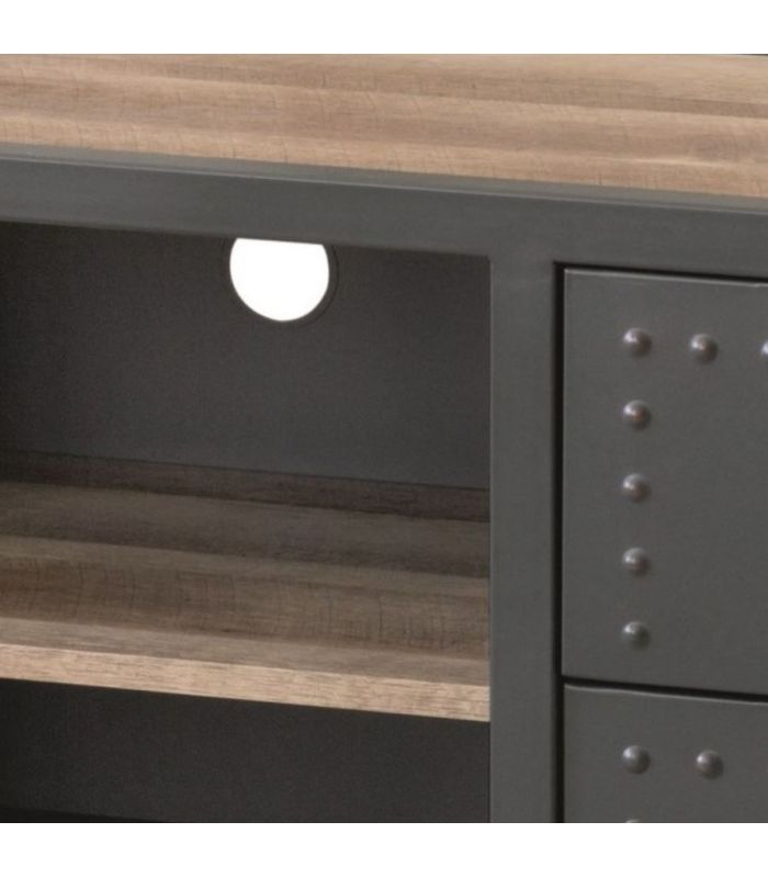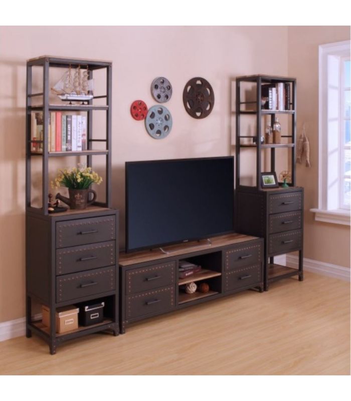 Mueble TV Sergio, de estilo industrial, con estructura metálica en grafito y baldas en MDF acabado Canyon. Compuesto por 4 cajones y baldas centrales. La trasera permite la salida de cables, para facilitar el acceso. Cuenta con la posibilidad de combinar la composición de salón con estantería del mismo modelo.
