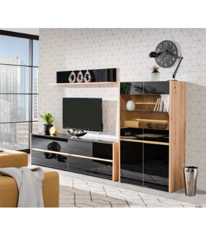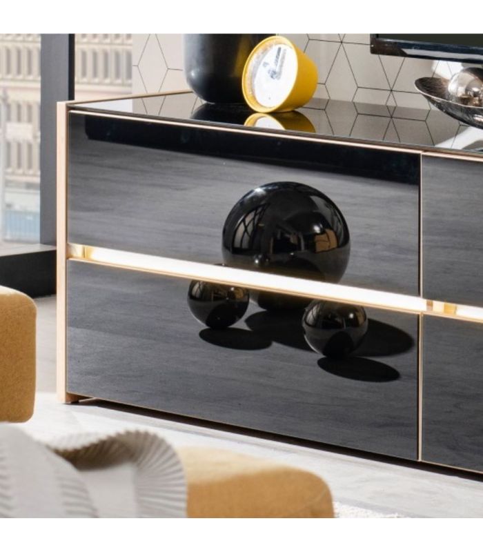 Molise es una colección que cuida cada detalle, con un resultado espectacular. El Mueble TV Molise está fabricado en laminado sintético, con estructura e interior en color roble artisan y frentes en cristal negro. Los tiradores son tipo gola, con la posibiliad de añadir leds para potenciar el diseño. Dispone de 4 cajones de gran capacidad, con sistema de cierre progresivo. Es resistente a arañazos, golpes, altas temperaturas y humedad. Podrás tener un mueble de alta calidad a un precio excelente.