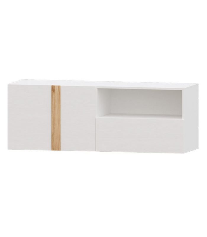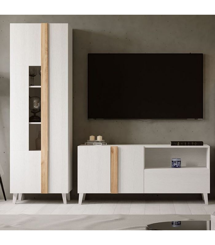 El Mueble TV Puzzle 140, destaca por su diseño nórdico, elegante y actual. Está terminado en Blanco, con tiradores en Roble. Ofrece la posibilidad de añadirle patas para una mayor altura. Su terminación de colores, aportará a la estancia gran amplitud, así como un toque ideal de calidez.