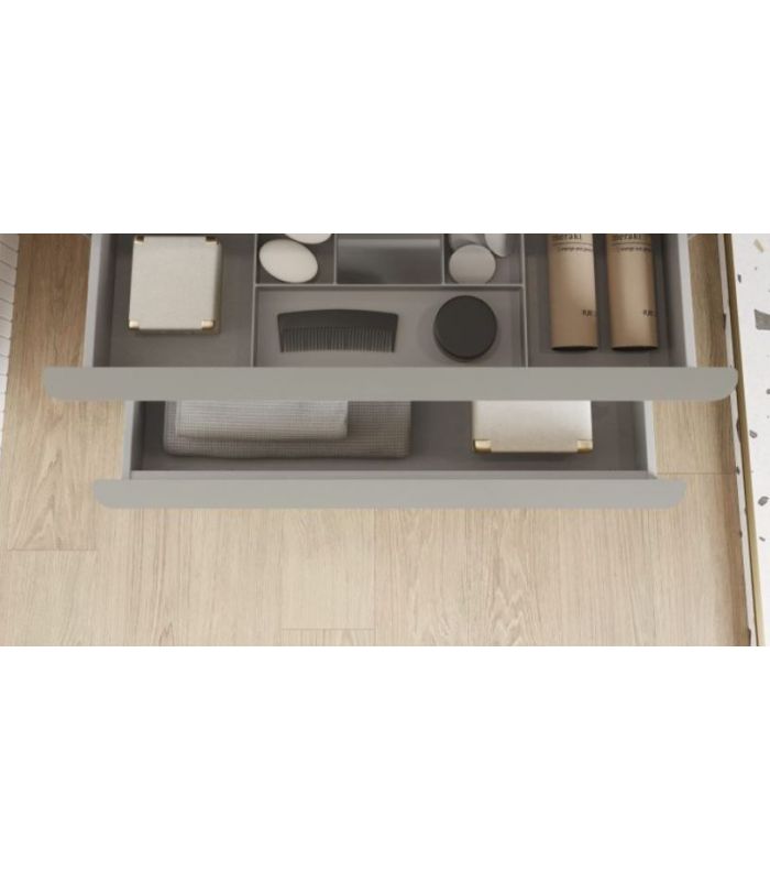El mueble de baño Dai es un modelo con diseño moderno y elegante. Está pensado para utilizar a diario, ya que cuenta con sistema de cierre progresivo, para no estropear las guías de extracción, así no pegará golpe al cerrarlo. Los tiradores de los cajones son metálicos integrados en el frontal. El cajón superior cuenta con bandeja organizadora, para poner multitud de productos que tenemos en el baño, peine, crema... El interior de los cajones está fabricado en acabado fumé cuero.