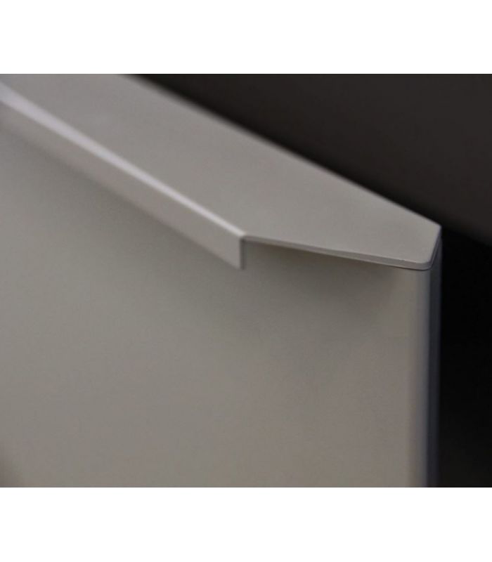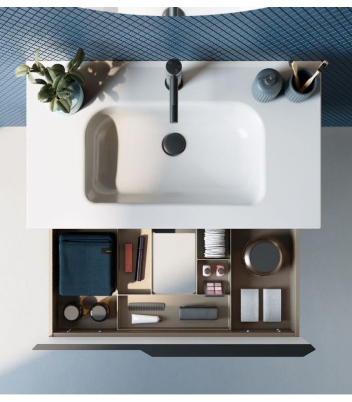 El mueble de baño Mio está compuesto por 2 cajones, con cajón organizador para guardar objetos, con gran capacidad de almacenaje, y así poner multitud de productos que tenemos en el baño, peine, crema... El interior está fabricado en acabado fumé cuero. Su diseño sobrio, de líneas rectas con un acabado moderno y elegante. Está pensado para utilizar a diario, ya que cuenta con sistema de cierre progresivo, para no estropear las bisagras, así no pegará golpe al cerrarlo. Los tiradores metálicos con personalidad, están unidos al frente en forma de inglete. El acabdo del tirador depende del acabado del mueble: