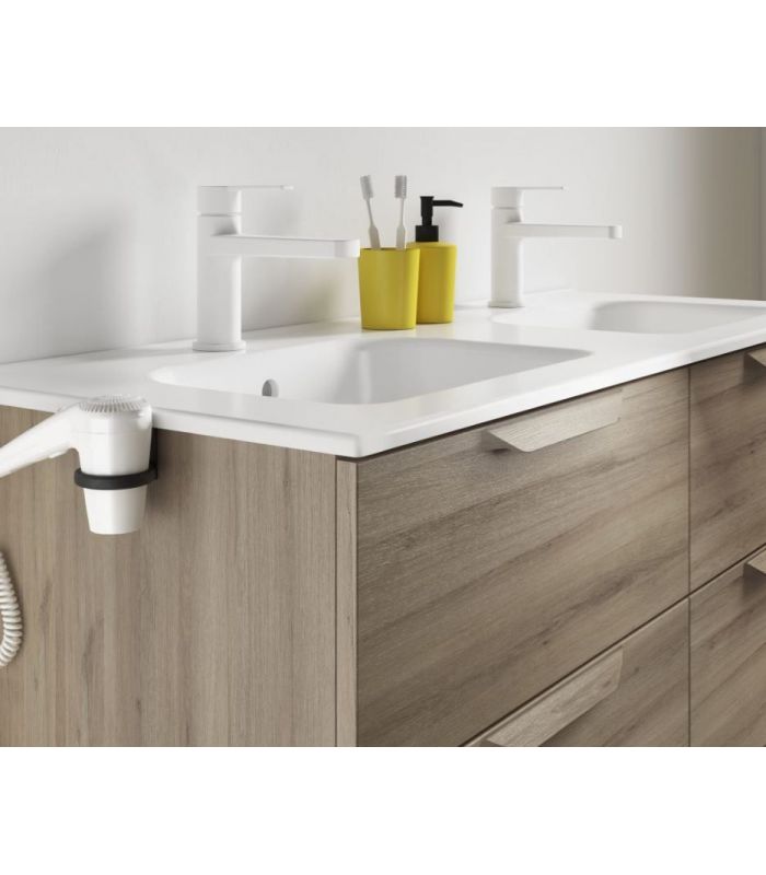 El mueble de baño Urban en medida de 120 cm, está compuesto por 2 cajones de grandes dimensiones o 4 cajones más pequeños. El cajón superior cuenta con organizador para guardar objetos, con gran capacidad de almacenaje, y así poner multitud de productos que tenemos en el baño, peine, crema... El interior está fabricado en acabado textil, en color gris. Su diseño es sencillo, de líneas rectas con un acabado moderno y elegante. Está pensado para utilizar a diario, ya que cuenta con sistema de cierre progresivo, para no estropear las bisagras, así no pegará golpe al cerrarlo. Los tiradores están integrados en el frente, al recubrirlo se consigue la sensación de pieza única revestida.